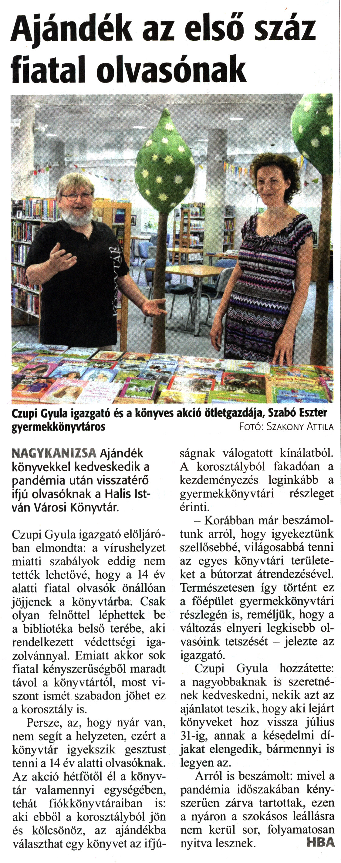 Nyilvános 1421 | 1741 | Zalai Hírlap 2021. július 9. 157. szám 16. oldal | Ajándék az első száz fiatal olvasónak Czupi Gyula igazgató és a könyves akció ötletgazdája. Szabó Eszter gyermekkönyvtáros Fotó: Szakony Attila NAGYKANIZSA Ajándék könyvekkel kedveskedik a pandémia után visszatérő ifjú olvasóknak a Halis István Városi Könyvtár. Czupi Gyula igazgató elöljáróban elmondta: a vírushelyzet miatti szabályok eddig nem tették lehetővé, hogy a 14 év alatti fiatal olvasók önállóan jöjjenek a könyvtárba. Csak olyan felnőttel léphettek be a bibliotéka belső terébe, aki rendelkezett védettségi igazolvánnyal. Emiatt akkor sok fiatal kényszerűségből maradt távol a könyvtártól, most viszont ismét szabadon jöhet ez a korosztály is. Persze, az, hogy nyár van, nem segít a helyzeten, ezért a könyvtár igyekszik gesztust tenni a 14 év alatti olvasóknak. Az akció hétfőtől él a könyvtár valamennyi egységében, tehát fiókkönyvtáraiban is: aki ebből a korosztályból jön és kölcsönöz, az ajándékba választhat egy könyvet az ifjúságnak válogatott kínálatból. A korosztályból fakadóan a kezdeményezés leginkább a gyermekkönyvtári részleget érinti. - Korábban már beszámoltunk arról, hogy igyekeztünk szellősebbé, világosabbá tenni az egyes könyvtári területeket a bútorzat átrendezésével. Természetesen így történt ez a főépület gyermekkönyvtári részlegén is, reméljük, hogy a változás elnyeri legkisebb olvasóink tetszését - jelezte az igazgató. Czupi Gyula hozzátette: a nagyobbaknak is szeretnének kedveskedni, nekik azt az ajánlatot teszik, hogy aki lejárt könyveket hoz vissza július 31-ig, annak a késedelmi díjakat elengedik, bármennyi is legyen az. Arról is beszámolt: mivel a pandémia időszakában kényszerűen zárva tartottak, ezen a nyáron a szokásos leállásra nem kerül sor, folyamatosan nyitva lesznek. HBA |
