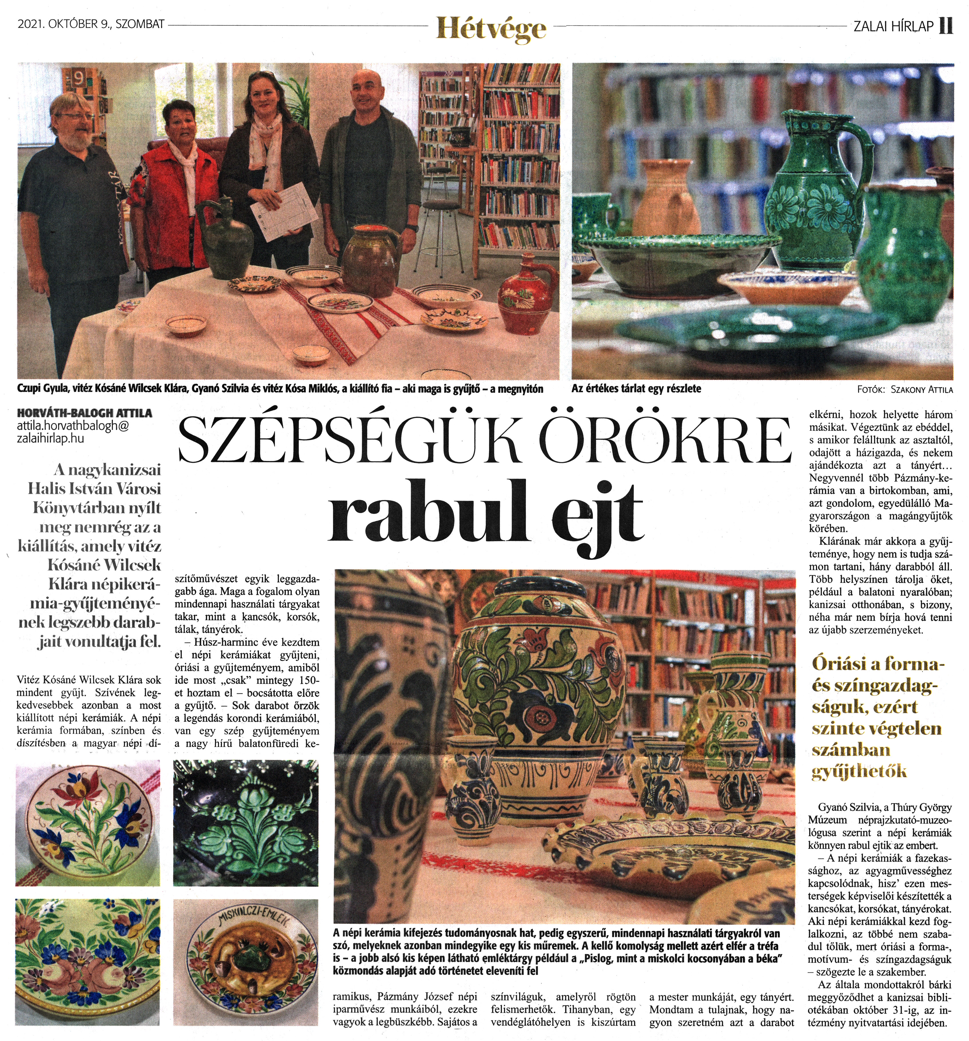 Nyilvános 1262 | 1932 | Zalai Hírlap 2021. október 9. 235. szám 11. oldal | SZÉPSÉGÜK ÖRÖKRE rabul ejt HORVÁTH-BALOGH ATTILA attila.horvathbalogh@zalaihirlap.hu A nagykanizsai Halis István Városi Könyvtárban nyílt meg nemrég az a kiállítás, amely vitéz Kósáné Wilcsek Klára népikerámia-gyűjteményének legszebb darabjait vonultatja lel. Vitéz Kósáné Wilcsek Klára sok mindent gyűjt. Szívének legkedvesebbek azonban a most kiállított népi kerámiák. A népi kerámia formában, színben és díszítésben a magyar népi díszítőművészet egyik leggazdagabb ága. Maga a fogalom olyan mindennapi használati tárgyakat takar, mint a kancsók, korsók, tálak, tányérok. - Húsz-harminc éve kezdtem el népi kerámiákat gyűjteni, óriási a gyűjteményem, amiből ide most „csak" mintegy 150-et hoztam el - bocsátotta előre a gyűjtő. - Sok darabot őrzök a legéndás korondi kerámiából, van egy szép gyűjteményem a nagy hírű balatonfüredi keramikus, Pázmány József népi iparművész munkáiból, ezekre vagyok a legbüszkébb. Sajátos a színviláguk, amelyről rögtön felismerhetők. Tihanyban, egy vendéglátóhelyen is kiszúrtam a mester munkáját, egy tányért. Mondtam a tulajnak, hogy nagyon szeretném azt a darabot elkérni, hozok helyette három másikat. Végeztünk az ebéddel, s amikor felálltunk az asztaltól, odajött a házigazda, és nekem ajándékozta azt a tányért... Negyvennél több Pázmány-kerámia van a birtokomban, ami, azt gondolom, egyedülálló Magyarországon a magángyűjtők körében. Klárának már akkora a gyűjteménye, hogy nem is tudja számon tartani, hány darabból áll. Több helyszínen tárolja őket, például a balatoni nyaralóban; kanizsai otthonában, s bizony, néha már nem bírja hová tenni az újabb szerzeményeket. Gyanó Szilvia, a Thúry György Múzeum néprajzkutató-muzeológusa szerint a népi kerámiák könnyen rabul ejtik az embert. - A népi kerámiák a fazekassághoz, az agyagművességhez kapcsolódnak, hisz'' ezen mesterségek képviselői készítették a kancsókat, korsókat, tányérokat. Aki népi kerámiákkal kezd foglalkozni, az többé nem szabadul tőlük, mert óriási a forma-, motívum- és színgazdagságuk - szögezte le a szakember. Az általa mondottakról bárki meggyőződhet a kanizsai bibliotékában október 31-ig, az intézmény nyitvatartási idejében. A népi kerámia kifejezés tudományosnak hat, pedig egyszerű, mindennapi használati tárgyakról van szó, melyeknek azonban mindegyike egy kis műremek. A kellő komolyság mellett azért elfér a tréfa is - a jobb alsó kis képen látható emléktárgy például a „Pislog, mint a miskolci kocsonyában a béka" közmondás alapját adó történetet eleveníti fel Az értékes tárlat egy részlete Czupi Gyula, vitéz Kósáné Wilcsek Klára, Gyanó Szilvia és vitéz Kósa Miklós, a kiállító fia - aki maga is gyűjtő - a megnyitón Fotók: Szakony Attila |