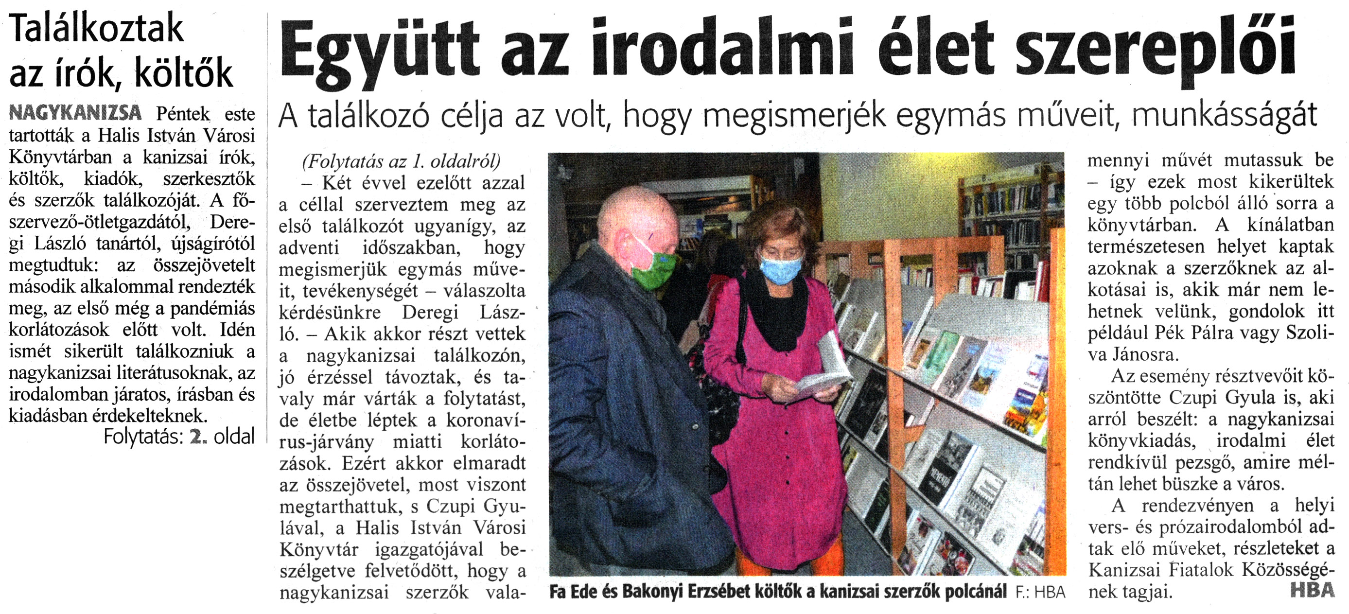 Nyilvános 1208 | 1734 | Zalai Hírlap 2021. december 13. 288. szám 1, 2. oldal | Találkoztak az írók, költők NAGYKANIZSA Péntek este tartották a Halis István Városi Könyvtárban a kanizsai írók, költők, kiadók, szerkesztők és szerzők találkozóját. A főszervező-ötletgazdától, Deregi László tanártól, újságírótól megtudtuk: az összejövetelt második alkalommal rendezték meg, az első még a pandémiás korlátozások előtt volt. Idén ismét sikerült találkozniuk a nagykanizsai literátusoknak, az irodalomban járatos, írásban és kiadásban érdekelteknek. Folytatás: 2. oldal Együtt az irodalmi élet szereplői A találkozó célja az volt, hogy megismerjék egymás műveit, munkásságát (Folytatás az 1. oldalról) - Két évvel ezelőtt azzal a céllal szerveztem meg az első találkozót ugyanígy, az adventi időszakban, hogy megismerjük egymás müveit, tevékenységét - válaszolta kérdésünkre Deregi László. - Akik akkor részt vettek a nagykanizsai találkozón, jó érzéssel távoztak, és tavaly már várták a folytatást, de életbe léptek a koronavírus-járvány miatti korlátozások. Ezért akkor elmaradt az összejövetel, most viszont megtarthattuk, s Czupi Gyulával, a Halis István Városi Könyvtár igazgatójával beszélgetve felvetődött, hogy a nagykanizsai szerzők valamennyi müvét mutassuk be - így ezek most kikerültek egy több polcból álló sorra a könyvtárban. A kínálatban természetesen helyet kaptak azoknak a szerzőknek az alkotásai is, akik már nem lehetnek velünk, gondolok itt például Pék Pálra vagy Szoliva Jánosra. Az esemény résztvevőit köszöntötte Czupi Gyula is, aki arról beszélt: a nagykanizsai könyvkiadás, irodalmi élet rendkívül pezsgő, amire méltán lehet büszke a város. A rendezvényen a helyi vers- és prózairodalomból adtak elő műveket, részleteket a Kanizsai Fiatalok Közösségének tagjai. HBA Fa Ede és Bakonyi Erzsébet költők a kanizsai szerzők polcánál F : HBA |