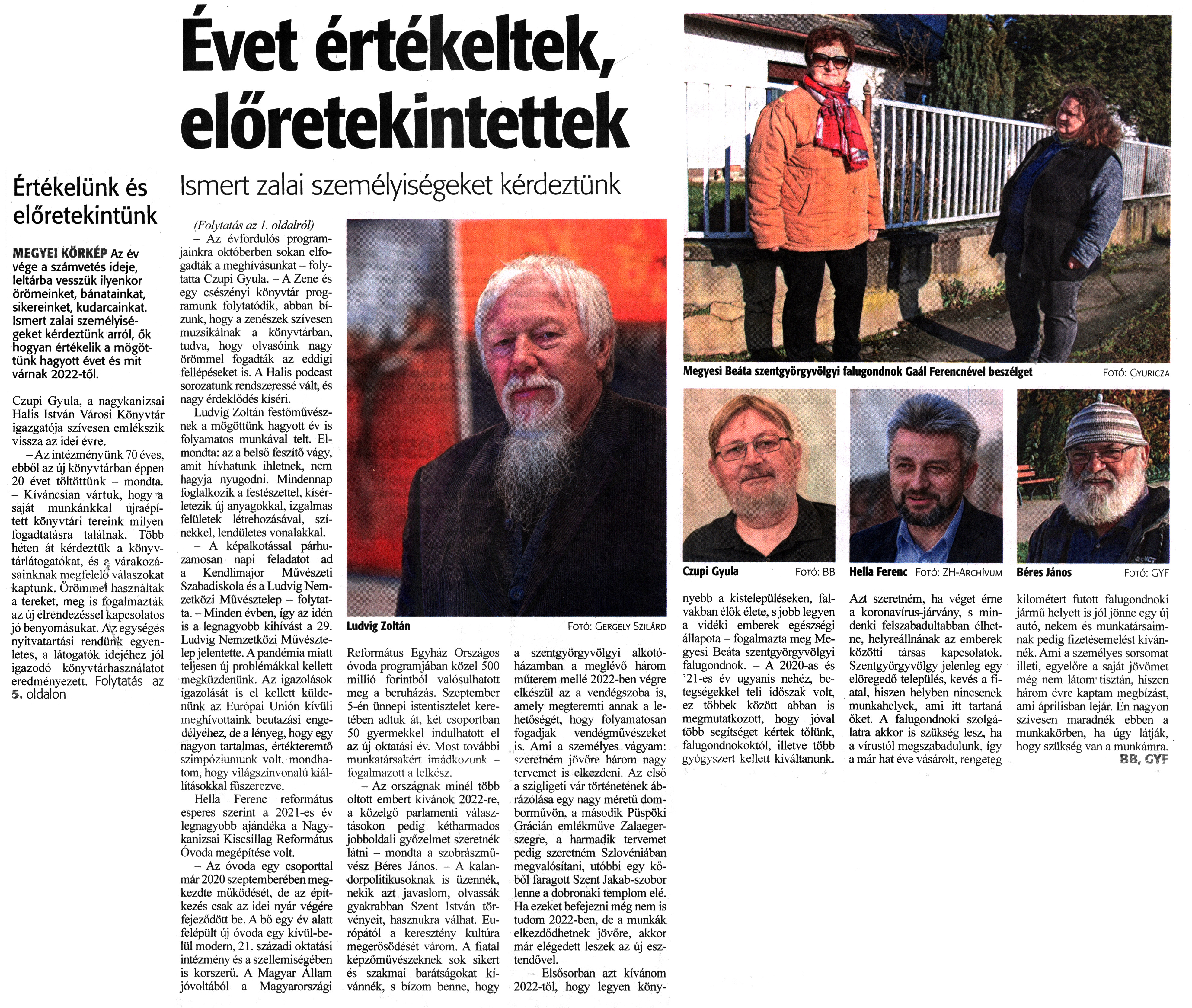 Nyilvános 1253 | 1850 | Zalai Hírlap 2021. december 31. 303. szám 1, 5. oldal | Évet értékeltek, előretekintettek Ismert zalai személyiségeket kérdeztünk Értékelünk és előretekintünk MEGYEI KÖRKÉP Az év vége a számvetés ideje, leltárba vesszük ilyenkor örömeinket, bánatainkat, sikereinket, kudarcainkat. Ismert zalai személyiségeket kérdeztünk arról, ők hogyan értékelik a mögöttünk hagyott évet és mit várnak 2022-től. Czupi Gyula, a nagykanizsai Halis István Városi Könyvtár igazgatója szívesen emlékszik vissza az idei évre. - Az intézményünk 70 éves, ebből az új könyvtárban éppen 20 évet töltöttünk - mondta. - Kíváncsian vártuk, hogy a saját munkánkkal újraépített könyvtári tereink milyen fogadtatásra találnak. Több héten át kérdeztük a könyvtárlátogatókat, és a várakozásainknak megfelelő válaszokat kaptunk. Örömmel használták a tereket, meg is fogalmazták az új elrendezéssel kapcsolatos jó benyomásukat. Az egységes nyitvatartási rendünk egyenletes, a látogatók idejéhez jól igazodó könyvtárhasználatot eredményezett. Folytatás az 5. oldalon (Folytatás az 1. oldalról) - Az évfordulós programjainkra októberben sokan elfogadták a meghívásunkat - folytatta Czupi Gyula. - A Zene és egy csészényi könyvtár programunk folytatódik, abban bízunk, hogy a zenészek szívesen muzsikálnak a könyvtárban, tudva, hogy olvasóink nagy örömmel fogadták az eddigi fellépéseket is. A Halis podcast sorozatunk rendszeressé vált, és nagy érdeklődés kíséri. Ludvig Zoltán festőművésznek a mögöttünk hagyott év is folyamatos munkával telt. Elmondta: az a belső feszítő vágy, amit hívhatunk ihletnek, nem hagyja nyugodni. Mindennap foglalkozik a festészettel, kísérletezik új anyagokkal, izgalmas felületek létrehozásával, színekkel, lendületes vonalakkal. - A képalkotással párhuzamosan napi feladatot ad a Kendlimajor Művészeti Szabadiskola és a Ludvig Nemzetközi Művésztelep - folytatta. - Minden évben, így az idén is a legnagyobb kihívást a 29. Ludvig Nemzetközi Művésztelepjelentette. A pandémia miatt teljesen új problémákkal kellett megküzdenünk. Az igazolások igazolását is el kellett küldenünk az Európai Unión kívüli meghívottaink beutazási engedélyéhez, de a lényeg, hogy egy nagyon tartalmas, értékteremtő szimpóziumunk volt, mondhatom, hogy világszínvonalú kiállításokkal fűszerezve. Hella Ferenc református esperes szerint a 202l-es év legnagyobb ajándéka a Nagykanizsai Kiscsillag Református Óvoda megépítése volt. - Az óvoda egy csoporttal már 2020 szeptemberében megkezdte működését, de az építkezés csak az idei nyár végére fejeződött be. A bő egy év alatt felépült új óvoda egy kívül-belül modern, 21. századi oktatási intézmény és a szellemiségében is korszerű. A Magyar Állam jóvoltából a Magyarországi Református Egyház Országos óvoda programjában közel 500 millió forintból valósulhatott meg a beruházás. Szeptember 5-én ünnepi istentisztelet keretében adtuk át, két csoportban 50 gyermekkel indulhatott el az új oktatási év. Most további munkatársakért imádkozunk - fogalmazott a lelkész. - Az országnak minél több oltott embert kívánok 2022-re, a közelgő parlamenti választásokon pedig kétharmados jobboldali győzelmet szeretnék látni - mondta a szobrászművész Béres János. - A kalandorpolitikusoknak is üzennék, nekik azt javaslom, olvassák gyakrabban Szent István törvényeit, hasznukra válhat. Európától a keresztény kultúra megerősödését várom. A fiatal képzőművészeknek sok sikert és szakmai barátságokat kívánnék, s bízom benne, hogy a szentgyörgyvölgyi alkotóházamban a meglévő három műterem mellé 2022-ben végre elkészül az a vendégszoba is, amely megteremti annak a lehetőségét, hogy folyamatosan fogadjak vendégművészeket is. Ami a személyes vágyam: szeretném jövőre három nagy tervemet is elkezdeni. Az első a szigligeti vár történetének ábrázolása egy nagy méretű domborművön, a második Püspöki Grácián emlékműve Zalaegerszegre, a harmadik tervemet pedig szeretném Szlovéniában megvalósítani, utóbbi egy kőből faragott Szent Jakab-szobor lenne a dobronaki templom elé. Ha ezeket befejezni még nem is tudom 2022-ben, de a munkák elkezdődhetnek jövőre, akkor már elégedett leszek az új esztendővel. - Elsősorban azt kívánom 2022-től, hogy legyen könnyebb a kistelepüléseken, falvakban élők élete, s jobb legyen a vidéki emberek egészségi állapota - fogalmazta meg Megyesi Beáta szentgyörgyvölgyi falugondnok. - A 2020-as és ''''21-es év ugyanis nehéz, betegségekkel teli időszak volt, ez többek között abban is megmutatkozott, hogy jóval több segítséget kértek tőlünk, falugondnokoktól, illetve több gyógyszert kellett kiváltanunk. Azt szeretném, ha véget érne a koronavírus-járvány, s mindenki felszabadultabban élhetne, helyreállnának az emberek közötti társas kapcsolatok. Szentgyörgyvölgy jelenleg egy elöregedő település, kevés a fiatal, hiszen helyben nincsenek munkahelyek ami itt tartaná őket. A falugondnoki szolgálatra akkor is szükség lesz, ha a vírustól megszabadulunk, így a már hat éve vásárolt, rengeteg kilométert futott falugondnoki jármű helyett is jól jönne egy új autó, nekem és munkatársaimnak pedig fizetésemelést kívánnék. Ami a személyes sorsomat illeti, egyelőre a saját jövőmet még nem látom tisztán, hiszen három évre kaptam megbízást, ami áprilisban lejár. Én nagyon szívesen maradnék ebben a munkakörben, ha úgy látják, hogy szükség van a munkámra. BB, GYF |
