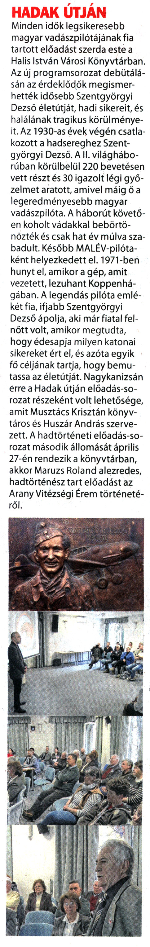 Nyilvános 1331 | 1709 | Kanizsa 2022. április 8. 7. szám 3. oldal | HADAK ÚTJÁN Minden idők legsikeresebb magyar vadászpilótájának fia tartott előadást szerda este a Halis István Városi Könyvtárban. Az új programsorozat debütálásán az érdeklődők megismerhették idősebb Szentgyörgyi Dezső életútját, hadi sikereit, és halálának tragikus körülményeit. Az 1930-as évek végén csatlakozott a hadsereghez Szentgyörgyi Dezső. A II. világháborúban körülbelül 220 bevetésen vett részt és 30 igazolt légi győzelmet aratott, amivel máig ő a legeredményesebb magyar vadászpilóta. A háborút követően koholt vádakkal bebörtönözték és csak hat év múlva szabadult. Később MALÉV-pilótaként helyezkedettel. 1971-ben hunyt el, amikor a gép, amit vezetett, lezuhant Koppenhágában. A legendás pilóta emlékét fia, ifjabb Szentgyörgyi Dezső ápolja, aki már fiatal felnőtt volt, amikor megtudta, hogy édesapja milyen katonai sikereket ért el, és azóta egyik fő céljának tartja, hogy bemutassa az életútját. Nagykanizsán erre a Hadak útján előadás-sorozat részeként volt lehetősége, amit Musztács Krisztán könyvtáros és Huszár András szervezett. A hadtörténeti előadás-sorozat második állomását április 27-én rendezik a könyvtárban, akkor Maruzs Roland alezredes, hadtörténész tart előadást az Arany Vitézségi Érem történetéről. |