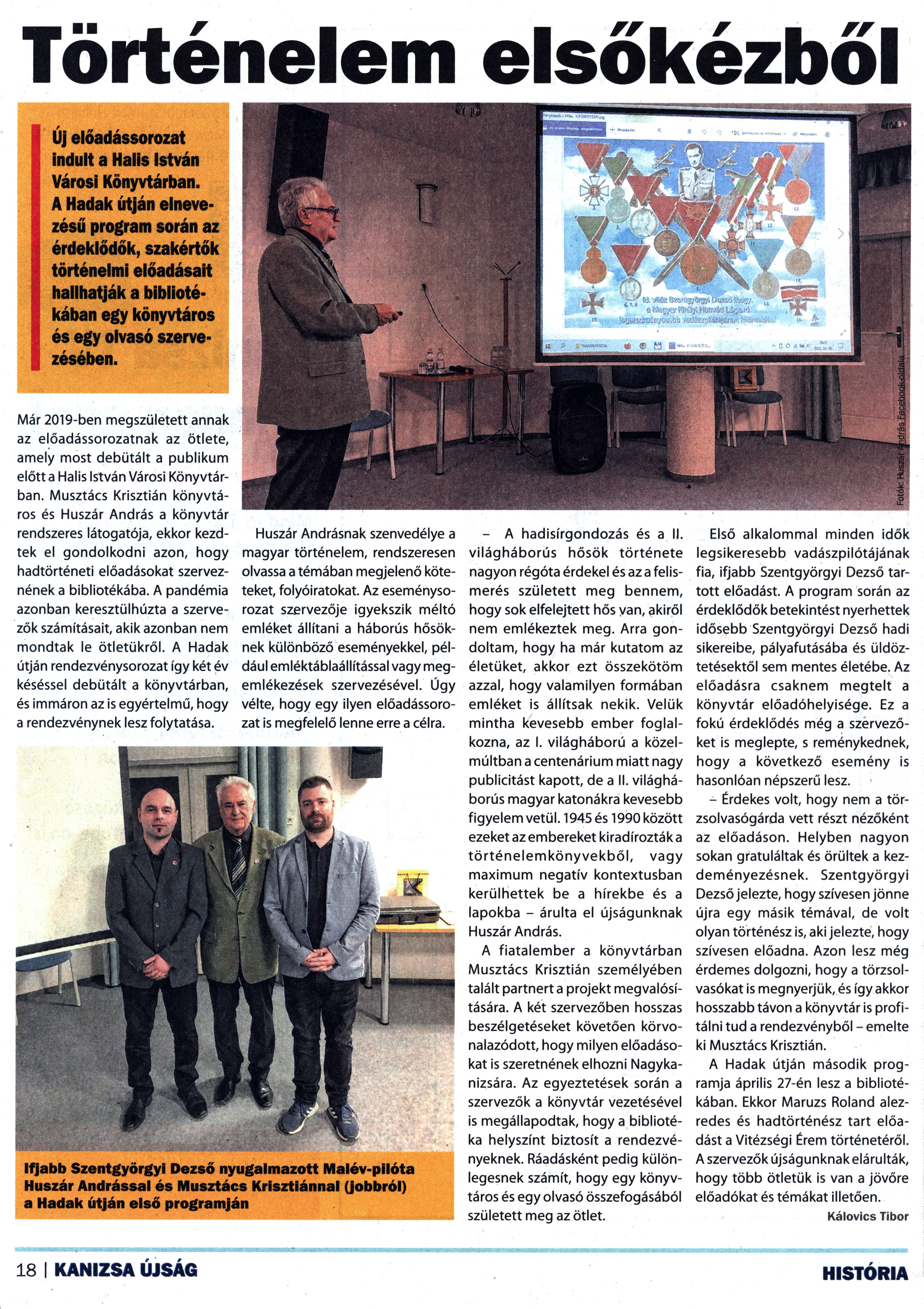 Nyilvános 1364 | 1728 | Kanizsa 2022. április 22. 8. szám 18. oldal | Történelem elsőkézből Új előadássorozat indult a Halis István Városi Könyvtárban. A Hadak útján elnevezésű program során az érdeklődők, szakértők történelmi előadásait hallhatják a bibliotékában egy könyvtáros és egy olvasó szervezésében. Már 2019-ben megszületett annak az előadássorozatnak az ötlete, amely most debütált a publikum előtt a Halis István Városi Könyvtárban. Musztács Krisztián könyvtáros és Huszár András a könyvtár rendszeres látogatója, ekkor kezdtek el gondolkodni azon, hogy hadtörténeti előadásokat szerveznének a bibliotékába. A pandémia azonban keresztülhúzta a szervezők számításait, akik azonban nem mondtak le ötletükről. A Hadak útján rendezvénysorozat így két év késéssel debütált a könyvtárban, és immáron az is egyértelmű, hogy a rendezvénynek lesz folytatása. Huszár Andrásnak szenvedélye a magyar történelem, rendszeresen olvassa a témában megjelenő köteteket, folyóiratokat. Az eseménysorozat szervezője igyekszik méltó emléket állítani a háborús hősöknek különböző eseményekkel, például emléktáblaállítással vagy megemlékezések szervezésével. Úgy vélte, hogy egy ilyen előadássorozat is megfelelő lenne erre a célra. - A hadisírgondozás és a II. világháborús hősök története nagyon régóta érdekel és az a felismerés született meg bennem, hogy sok elfelejtett hős van, akiről nem emlékeztek meg. Arra gondoltam, hogy ha már kutatom az életüket, akkor ezt összekötöm azzal, hogy valamilyen formában emléket is állítsak nekik. Velük mintha kevesebb ember foglalkozna, az I. világháború a közelmúltban a centenárium miatt nagy publicitást kapott, de a II. világháborús magyar katonákra kevesebb figyelem vetül. 1945és 1990 között ezeket az embereket kiradírozták a történelemkönyvekből, vagy maximum negatív kontextusban kerülhettek be a hírekbe és a lapokba - árulta el újságunknak Huszár András. A fiatalember a könyvtárban Musztács Krisztián személyében talált partnert a projekt megvalósítására. A két szervezőben hosszas beszélgetéseket követően körvonalazódott, hogy milyen előadásokat is szeretnének elhozni Nagykanizsára. Az egyeztetések során a szervezők a könyvtár vezetésével is megállapodtak, hogy a bibliotéka helyszínt biztosít a rendezvényeknek. Ráadásként pedig különlegesnek számít, hogy egy könyvtáros és egy olvasó összefogásából született meg az ötlet. Első alkalommal minden idők legsikeresebb vadászpilótájának fia, ifjabb Szentgyörgyi Dezső tartott előadást. A program során az érdeklődők betekintést nyerhettek idősebb Szentgyörgyi Dezső hadi sikereibe, pályafutásába és üldöztetésektől sem mentes életébe. Az előadásra csaknem megtelt a könyvtár előadóhelyisége. Ez a fokú érdeklődés még a szervezőket is meglepte, s reménykednek, hogy a következő esemény is hasonlóan népszerű lesz. - Érdekes volt, hogy nem a törzsolvasógárda vett részt nézőként az előadáson. Helyben nagyon sokan gratuláltak és örültek a kezdeményezésnek. Szentgyörgyi Dezső jelezte, hogy szívesen jönne újra egy másik témával, de volt olyan történész is, aki jelezte, hogy szívesen előadna. Azon lesz még érdemes dolgozni, hogy a törzsolvasókat is megnyerjük, és így akkor hosszabb távon a könyvtár is profitálni tud a rendezvényből - emelte ki Musztács Krisztián. A Hadak útján második programja április 27-én lesz a bibliotékában. Ekkor Maruzs Roland alezredes és hadtörténész tart előadást a Vitézségi Érem történetéről. A szervezők újságunknak elárulták, hogy több ötletük is van a jövőre előadókat és témákat illetően. Kálovics Tibor Ifjabb Szentgyörgyi Dezső nyugalmazott Malév-pilóta Huszár Andrással és Musztács Krisztiánnal (jobbról) a Hadak útján első programján |