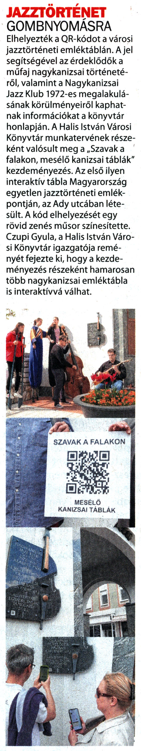 Nyilvános 1327 | 1911 | Kanizsa 2022. május 6. 9. szám 3. oldal | JAZZTÖRTÉNET GOMBNYOMÁSRA Elhelyezték a QR-kódot a városi jazztörténeti emléktáblán. A jel segítségével az érdeklődők a műfaj nagykanizsai történetéről, valamint a Nagykanizsai Jazz Klub 1972-es megalakulásának körülményeiről kaphatnak információkat a könyvtár honlapján. A Halis István Városi Könyvtár munkatervének részeként valósult meg a „Szavak a falakon, mesélő kanizsai táblák" kezdeményezés. Az első ilyen interaktív tábla Magyarország egyetlen jazztörténeti emlékpontján, az Ady utcában létesült. A kód elhelyezését egy rövid zenés műsor színesítette. Czupi Gyula, a Halis István Városi Könyvtár igazgatója reményét fejezte ki, hogy a kezdeményezés részeként hamarosan több nagykanizsai emléktábla is interaktívvá válhat. MESÉLŐ KANIZSAI TÁBLÁK szavak a falakon |