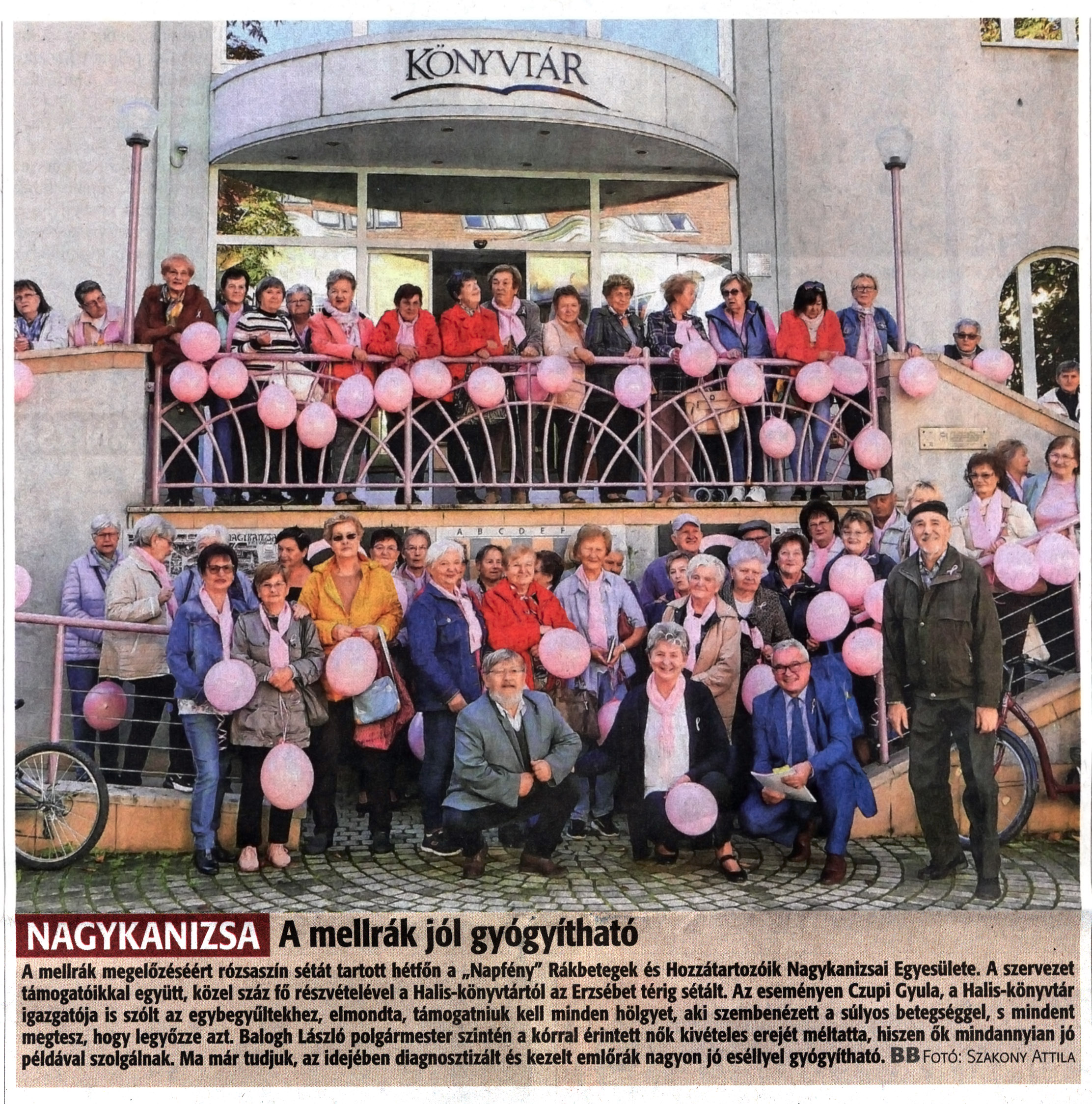 Nyilvános 1225 | 1605 | Zalai Hírlap 2022. október 4. 231. szám 1. oldal | Nagykanizsa - A mellrák jól gyógyítható A mellrák megelőzéséért rózsaszín sétát tartott hétfőn a „Napfény" Rákbetegek és Hozzátartozóik Nagykanizsai Egyesülete. A szervezet támogatóikkal együtt, közel száz fő részvételévei a Halis-könyvtártól az Erzsébet térig sétált. Az eseményen Czupi Gyula, a Halis-könyvtár igazgatója is szólt az egybegyűltekhez, elmondta, támogatniuk kell minden hölgyet, aki szembenézett a súlyos betegséggel, s mindent megtesz, hogy legyőzze azt. Balogh László polgármester szintén a kórral érintett nők kivételes erejét méltatta, hiszen ők mindannyian jó példával szolgálnak. Ma már tudjuk, az idejében diagnosztizált és kezelt emlőrák nagyon jó eséllyel gyógyítható. BB fotó: Szakony Attila |