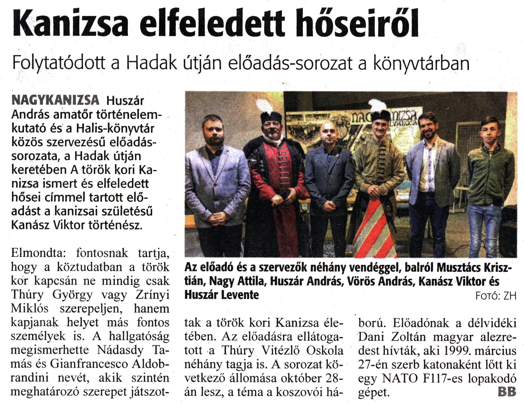 Nyilvános 1217 | 1461 | Zalai Hírlap 2022. október 19. 244. szám 3. oldal | Kanizsa elfeledett hőseiről Folytatódott a Hadak útján előadás-sorozat a könyvtárban NAGYKANIZSA Huszár András amatőr történelemkutató és a Halis-könyvtár közös szervezésű előadássorozata, a Hadak útján keretében A török kori Kanizsa ismert és elfeledett hősei címmel tartott előadást a kanizsai születésű Kanász Viktor történész. Elmondta: fontosnak tartja, hogy a köztudatban a török kor kapcsán ne mindig csak Thúry György vagy Zrínyi Miklós szerepeljen, hanem kapjanak helyet más fontos személyek is. A hallgatóság megismerhette Nádasdy Tamás és Gianfrancesco Aldobrandini nevét, akik szintén meghatározó szerepet játszottak a török kori Kanizsa életében. Az előadásra ellátogatott a Thúry Vitézlő Oskola néhány tagja is. A sorozat következő állomása október 28-án lesz, a téma a koszovói háború. Előadónak a délvidéki Dani Zoltán magyar alezredest hívták, aki 1999. március 27-én szerb katonaként lőtt ki egy NATO F117-es lopakodó gépet. BB Az előadó és a szervezők néhány vendéggel, balról Musztács Krisztián, Nagy Attila, Huszár András, Vörös András, Kanász Viktor és Huszár Levente Fotó: ZH |