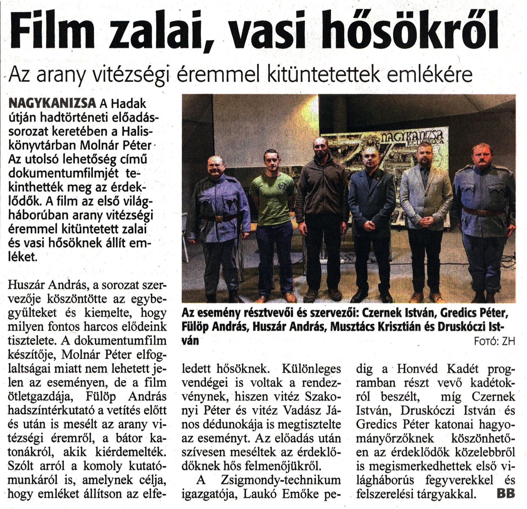 Nyilvános 1154 | 3406 | Zalai Hírlap 2022. december 14. 291. szám 5. oldal | Film zalai, vasi hősökről Az arany vitézségi éremmel kitüntetettek emlékére NAGYKANIZSA A Hadak útján hadtörténeti előadássorozat keretében a Halis-könyvtárban Molnár Péter Az utolsó lehetőség című dokumentumfilmjét tekinthették meg az érdeklődők. A film az első világháborúban arany vitézségi éremmel kitüntetett zalai és vasi hősöknek állít emléket. Huszár András, a sorozat szervezője köszöntötte az egybegyűlteket és kiemelte, hogy milyen fontos harcos elődeink tisztelete. A dokumentumfilm készítője, Molnár Péter elfoglaltságai miatt nem lehetett jelen az eseményen, de a film ötletgazdája, Fülöp András hadszíntérkutató a vetítés előtt és után is mesélt az arany vitézségi éremről, a bátor katonákról, akik kiérdemelték. Szólt arról a komoly kutatómunkáról is, amelynek célja, hogy emléket állítson az elfe- ledett hősöknek. Különleges vendégei is voltak a rendezvénynek, hiszen vitéz Szakonyi Péter és vitéz Vadász János dédunokája is megtisztelte az eseményt. Az előadás után szívesen meséltek az érdeklődőknek hős felmenőjükről. A Zsigmondy-technikum igazgatója, Laukó Emőke pedig a Honvéd Kadét programban részt vevő kadétokról beszélt, míg Czernek István, Druskóczi István és Gredics Péter katonai hagyományőrzőknek köszönhetően az érdeklődők közelebbről is megismerkedhettek első világháborús fegyverekkel és felszerelési tárgyakkal. BB Az esemény résztvevői és szervezői: Czernek István, Gredics Péter, Fülöp András, Huszár András, Musztács Krisztián és Druskóczi István Fotó: ZH |