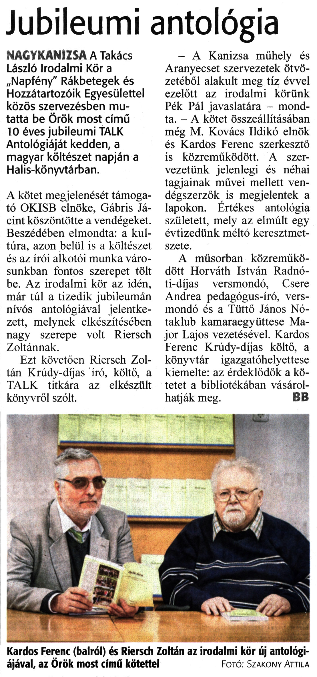 Nyilvános 1116 | 1365 | Zalai Hírlap 2023. április 13. 85. szám 2. oldal | Jubileumi antológia NAGYKANIZSA A Takács László Irodalmi Kör a „Napfény" Rákbetegek és Hozzátartozóik Egyesülettel közös szervezésben mutatta be Örök most című 10 éves jubileumi TALK Antológiáját kedden, a magyar költészet napján a Halis-könyvtárban. A kötet megjelenését támogató OKISB elnöke, Gábris Jácint köszöntötte a vendégeket. Beszédében elmondta: a kultúra, azon belül is a költészet és az írói alkotói munka városunkban fontos szerepet tölt be. Az irodalmi kör az idén, már túl a tizedik jubileumán nívós antológiával jelentkezett, melynek elkészítésében nagy szerepe volt Riersch Zoltánnak. Ezt követően Riersch Zoltán Krúdy-díjas író, költő, a TALK titkára az elkészült könyvről szólt. - A Kanizsa műhely és Aranyecset szervezetek ötvözetéből alakult meg tíz évvel ezelőtt az irodalmi körünk Pék Pál javaslatára - mondta. - A kötet összeállításában még M. Kovács Ildikó elnök és Kardos Ferenc szerkesztő is közreműködött. A szervezetünk jelenlegi és néhai tagjainak művei mellett vendégszerzők is megjelentek a lapokon. Értékes antológia született, mely az elmúlt egy évtizedünk méltó keresztmetszete. A műsorban közreműködött Horváth István Radnóti-díjas versmondó, Csere Andrea pedagógus-író, versmondó és a Tüttő János Nótaklub kamaraegyüttese Major Lajos vezetésével. Kardos Ferenc Krúdy-díjas költő, a könyvtár igazgatóhelyettese kiemelte: az érdeklődők a kötetet a bibliotékában vásárolhatják meg. BB Kardos Ferenc (balról) és Riersch Zoltán az irodalmi kör új antológiájával, az Örök most című kötettel Fotó. Szakony Attila |