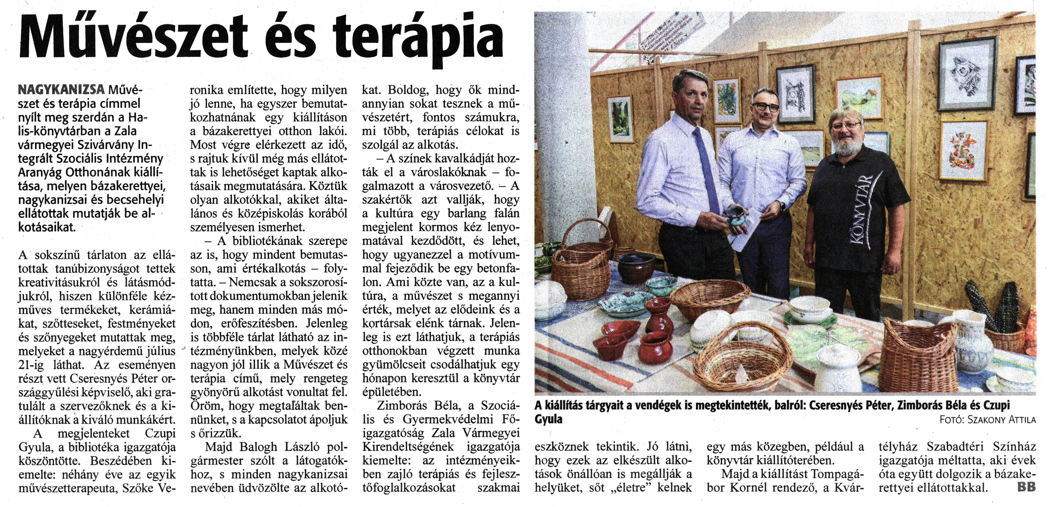 Nyilvános 1126 | 1645 | Zalai Hírlap 2023. június 22. 143. szám 5. oldal | Művészet és terápia NAGYKANIZSA Művészet és terápia címmel nyílt meg szerdán a Halis-könyvtárban a Zala vármegyei Szivárvány Integrált Szociális Intézmény Aranyág Otthonának kiállítása, melyen bázakerettyei, nagykanizsai és becsehelyi ellátottak mutatják be alkotásaikat. A sokszínű tárlaton az ellátottak tanúbizonyságot tettek kreativitásukról és látásmódjukról, hiszen különféle kézműves termékeket, kerámiákat, szőtteseket, festményeket és szőnyegeket mutattak meg, melyeket a nagyérdemű július 21-ig láthat. Az eseményen részt vett Cseresnyés Péter országgyűlési képviselő, aki gratulált a szervezőknek és a kiállítóknak a kiváló munkákért. A megjelenteket Czupi Gyula, a bibliotéka igazgatója köszöntötte. Beszédében kiemelte: néhány éve az egyik művészetterapeuta, Szőke Veronika említette, hogy milyen jó lenne, ha egyszer bemutatkozhatnának egy kiállításon a bázakerettyei otthon lakói. Most végre elérkezett az idő, s rajtuk kívül még más ellátottak is lehetőséget kaptak alkotásaik megmutatására. Köztük olyan alkotókkal, akiket általános és középiskolás korából személyesen ismerhet. - A bibliotékának szerepe az is, hogy mindent bemutasson, ami értékalkotás - folytatta. - Nemcsak a sokszorosított dokumentumokban jelenik meg, hanem minden más módon, erőfeszítésben. Jelenleg is többféle tárlat látható az intézményünkben, melyek közé nagyon jól illik a Művészet és terápia című, mely rengeteg gyönyörű alkotást vonultat fel. Öröm, hogy megtaláltak bennünket, s a kapcsolatot ápoljuk s őrizzük. Majd Balogh László polgármester szólt a látogatókhoz, s minden nagykanizsai nevében üdvözölte az alkotókat. Boldog, hogy ők mindannyian sokat tesznek a művészetért, fontos számukra, mi több, terápiás célokat is szolgál az alkotás. - A színek kavalkádját hozták el a városlakóknak - fogalmazott a városvezető. - A szakértők azt vallják, hogy a kultúra egy barlang falán megjelent kormos kéz lenyomatával kezdődött, és lehet, hogy ugyanezzel a motívummal fejeződik be egy betonfalon. Ami közte van, az a kultúra, a művészet s megannyi érték, melyet az elődeink és a kortársak elénk tárnak. Jelenleg is ezt láthatjuk, a terápiás otthonokban végzett munka gyümölcseit csodálhatjuk egy hónapon keresztül a könyvtár épületében. Zimborás Béla, a Szociális és Gyermekvédelmi Főigazgatóság Zala Vármegyei Kirendeltségének igazgatója kiemelte: az intézményeikben zajló terápiás és fejlesztőfoglalkozásokat szakmai eszköznek tekintik. Jó látni, hogy ezek az elkészült alkotások önállóan is megállják a helyüket, sőt „életre" kelnek egy más közegben, például a könyvtár kiállítóterében. Majd a kiállítást Tompagábor Kornél rendező, a Kvártélyház Szabadtéri Színház igazgatója méltatta, aki évek óta együtt dolgozik a bázakerettyei ellátottakkal. BB A kiállítás tárgyait a vendégek is megtekintették, balról: Cseresnyés Péter, Zimborás Béla és Czupi Gyula Fotó: Szakony Attila |