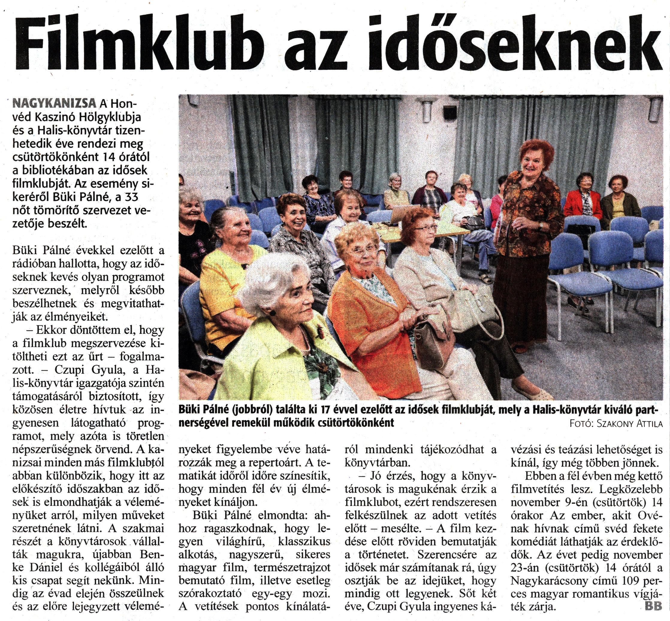 Nyilvános 1111 | 1380 | Zalai Hírlap 2023. november 2. 255. szám 6. oldal | Filmklub az időseknek NAGYKANIZSA A Honvéd Kaszinó Hölgyklubja és a Halis-könyvtár tizenhetedik éve rendezi meg csütörtökönként 14 órától a bibliotékában az idősek filmklubját. Az esemény sikeréről Büki Pálné, a 33 nőt tömörítő szervezet vezetője beszélt. Büki Pálné (jobbról) találta ki 17 évvel ezelőtt az idősek filmklubját, mely a Halis-könyvtár kiváló partnerségével remekül működik csütörtökönként Fotó: Szakony Attila Büki Pálné évekkel ezelőtt a rádióban hallotta, hogy az időseknek kevés olyan programot szerveznek, melyről később beszélhetnek és megvitathatják az élményeikét. - Ekkor döntöttem el, hogy a filmklub megszervezése kitöltheti ezt az űrt - fogalmazott. - Czupi Gyula, a Halis-könyvtár igazgatója szintén támogatásáról biztosított, így közösen életre hívtuk az ingyenesen látogatható programot, mely azóta is töretlen népszerűségnek örvend. A kanizsai minden más filmklubtól abban különbözik, hogy itt az előkészítő időszakban az idősek is elmondhatják a véleményüket arról, milyen műveket szeretnének látni. A szakmai részét a könyvtárosok vállalták magukra, újabban Benke Dániel és kollégáiból álló kis csapat segít nekünk. Mindig az évad elején összeülnek és az előre lejegyzett véleményeket figyelembe véve határozzák meg a repertoárt. A tematikát időről időre színesítik, hogy minden fél év új élményeket kínáljon. Büki Pálné elmondta: ahhoz ragaszkodnak, hogy legyen világhírű, klasszikus alkotás, nagyszerű, sikeres magyar film, természetrajzot bemutató film, illetve esetleg szórakoztató egy-egy mozi. A vetítések pontos kínálatáról mindenki tájékozódhat a könyvtárban. - Jó érzés, hogy a könyvtárosok is magukénak érzik a filmklubot, ezért rendszeresen felkészülnek az adott vetítés előtt - mesélte. - A film kezdése előtt röviden bemutatják a történetet. Szerencsére az idősek már számítanak rá, úgy osztják be az idejüket, hogy mindig ott legyenek. Sőt két éve, Czupi Gyula ingyenes kávézási és teázási lehetőséget is kínál, így még többen jönnek. Ebben a fél évben még kettő filmvetítés lesz. Legközelebb november 9-én (csütörtök) 14 órakor Az ember, akit Ové-nak hívnak című svéd fekete komédiát láthatják az érdeklődők. Az évet pedig november 23-án (csütörtök) 14 órától a Nagykarácsony című 109 perces magyar romantikus vígjáték zárja. BB |