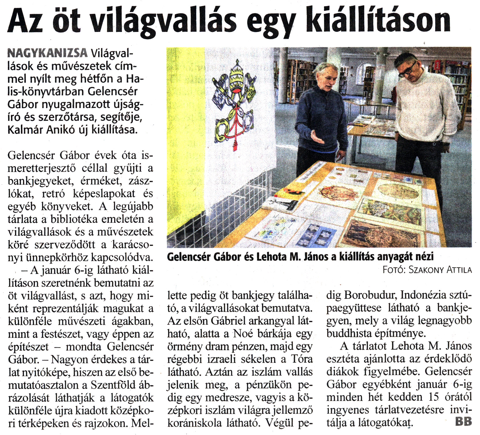 Nyilvános 1101 | 1399 | Zalai Hírlap 2023. december 5. 283. szám 3. oldal | Az öt világvallás egy kiállításon Gelencsér Gábor és Lehota M. János a kiállítás anyagát nézi Fotó: Szakony Attila NAGYKANIZSA Világvallások és művészetek címmel nyílt meg hétfőn a Ha-lis-könyvtárban Gelencsér Gábor nyugalmazott újságíró és szerzőtársa, segítője, Kalmár Anikó új kiállítása. Gelencsér Gábor évek óta ismeretterjesztő céllal gyűjti a bankjegyeket, érméket, zászlókat, retró képeslapokat és egyéb könyveket. A legújabb tárlata a bibliotéka emeletén a világvallások és a művészetek köré szerveződött a karácsonyi ünnepkörhöz kapcsolódva. -A január 6-ig látható kiállításon szeretnénk bemutatni az öt világvallást, s azt, hogy miként reprezentálják magukat a különféle művészeti ágakban, mint a festészet, vagy éppen az építészet - mondta Gelencsér Gábor. - Nagyon érdekes a tárlat nyitóképe, hiszen az első bemutatóasztalon a Szentföld ábrázolását láthatják a látogatók különféle újra kiadott középkori térképeken és rajzokon. Mellette pedig öt bankjegy található, a világvallásokat bemutatva. Az elsőn Gábriel arkangyal látható, alatta a Noé bárkája egy örmény dram pénzen, majd egy régebbi izraeli sékelen a Tóra látható. Aztán az iszlám vallás jelenik meg, a pénzükön pedig egy medresze, vagyis a középkori iszlám világra jellemző korániskola látható. Végül pe- dig Borobudur, Indonézia sztúpaegyüttese látható a bankjegyen, mely a világ legnagyobb buddhista építménye. A tárlatot Lehota M. János esztéta ajánlotta az érdeklődő diákok figyelmébe. Gelencsér Gábor egyébként január 6-ig minden hét kedden 15 órától ingyenes tárlatvezetésre invitálja a látogatókat. BB |