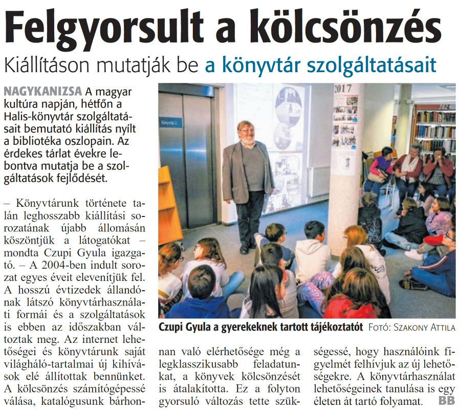 Nyilvános 1030 | 1532 | Zalai Hírlap 2024. január 23. 19. szám 16. oldal | Felgyorsult a kölcsönzés Kiállításon mutatják be a könyvtár szolgáltatásait NAGYKANIZSA A magyar kultúra napján, hétfőn a Halis-könyvtár szolgáltatásait bemutató kiállítás nyílt a bibliotéka oszlopain. Az érdekes tárlat évekre lebontva mutatja be a szolgáltatások fejlődését. - Könyvtárunk története talán leghosszabb kiállítási sorozatának újabb állomásán köszöntjük a látogatókat -mondta Czupi Gyula igazgató. - A 2004-ben indult sorozat egyes éveit elevenítjük fel. A hosszú évtizedek állandónak látszó könyvtárhasználati formái és a szolgáltatások is ebben az időszakban változtak meg. Az internet lehetőségei és könyvtárunk saját világháló-tartalmai új kihívások elé állítottak bennünket. A kölcsönzés számítógépessé válása, katalógusunk bárhonnan való elérhetősége még a legklasszikusabb feladatunkat, a könyvek kölcsönzését is átalakította. Ez a folyton gyorsuló változás tette szükségessé, hogy használóink figyelmét felhívjuk az új lehetőségekre. A könyvtárhasználat lehetőségeinek tanulása is egy életen át tartó folyamat. BB Czupi Gyula a gyerekeknek tartott tájékoztatót Fotó: Szakony Attila |