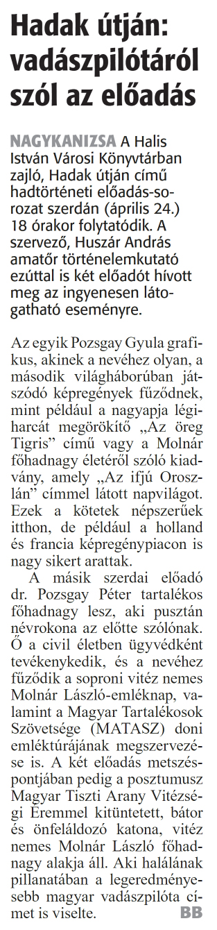 Nyilvános 1008 | 1538 | Zalai Hírlap 2024 április 24. 94. szám 2. oldal | Hadak útján: vadászpilótáról szól az előadás NAGYKANIZSA A Halis István Városi Könyvtárban zajló, Hadak útján című hadtörténeti előadás-sorozat szerdán (április 24.) 18 órakor folytatódik. A szervező, Huszár András amatőr történelemkutató ezúttal is két előadót hívott meg az ingyenesen látogatható eseményre. Az egyik Pozsgay Gyula grafikus, akinek a nevéhez olyan, a második világháborúban játszódó képregények fűződnek, mint például a nagyapja légiharcát megörökítő „Az öreg Tigris" című vagy a Molnár főhadnagy életéről szóló kiadvány, amely „Az ifjú Oroszlán" címmel látott napvilágot. Ezek a kötetek népszerűek itthon, de például a holland és francia képregénypiacon is nagy sikert arattak. A másik szerdai előadó dr. Pozsgay Péter tartalékos főhadnagy lesz, aki pusztán névrokona az előtte szólónak. Ő a civil életben ügyvédként tevékenykedik, és a nevéhez fűződik a soproni vitéz nemes Molnár László-emléknap, valamint a Magyar Tartalékosok Szövetsége (MATASZ) doni emléktúrájának megszervezése is. A két előadás metszéspontjában pedig a posztumusz Magyar Tiszti Arany Vitézségi Eremmel kitüntetett, bátor és önfeláldozó katona, vitéz nemes Molnár László főhadnagy alakja áll. Aki halálának pillanatában a legeredményesebb magyar vadászpilóta címet is viselte. BB |