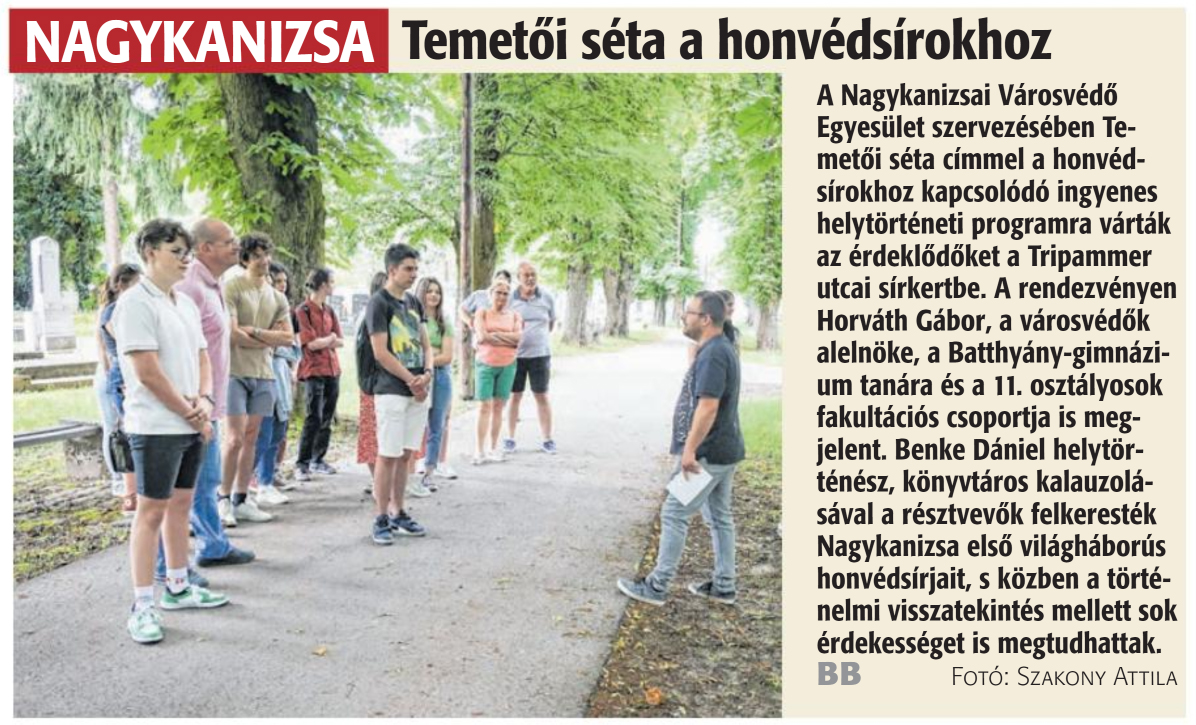 Nyilvános 935 | 1223 | Zalai Hírlap 2024. június 11. 134. szám 16. oldal | Temetői séta a honvédsírokhoz NAGYKANIZSA A Nagykanizsai Városvédő Egyesület szervezésében Temetői séta címmel a honvédsírokhoz kapcsolódó ingyenes helytörténeti programra várták az érdeklődőket a Tripammer utcai sírkertbe. A rendezvényen Horváth Gábor, a városvédők alelnöke, a Batthyány-gimnázium tanára és a 11. osztályosok fakultációs csoportja is megjelent. Benke Dániel helytörténész, könyvtáros kalauzolásával a résztvevők felkeresték Nagykanizsa első világháborús honvédsírjait, s közben a történelmi visszatekintés mellett sok érdekességet is megtudhattak. BB Fotó: Szakony Attila |