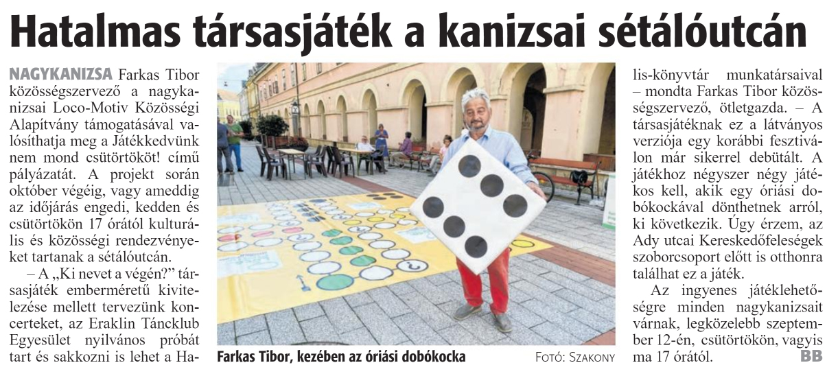 Nyilvános 998 | 1263 | Zalai Hírlap 2024. szeptember 12. 213. szám 6. oldal | Hatalmas társasjáték a kanizsai sétálóutcán NAGYKANIZSA Farkas Tibor közösségszervező a nagykanizsai Loco-Motiv Közösségi Alapítvány támogatásával valósíthatja meg a Játékkedvünk nem mond csütörtököt! című pályázatát. A projekt során október végéig, vagy ameddig az időjárás engedi, kedden és csütörtökön 17 órától kulturális és közösségi rendezvényeket tartanak a sétálóutcán. - A ,,Ki nevet a végén?" társasjáték emberméretü kivitelezése mellett tervezünk koncerteket, az Eraklin Táncklub Egyesület nyilvános próbát tart és sakkozni is lehet a Halis-könyvtár munkatársaival - mondta Farkas Tibor közösségszervező, ötletgazda. - A társasjátéknak ez a látványos verziója egy korábbi fesztiválon már sikerrel debütált. A játékhoz négyszer négy játékos kell, akik egy óriási dobókockával dönthetnek arról, ki következik. Ugy érzem, az Ady utcai Kereskedőfeleségek szoborcsoport előtt is otthonra találhat ez a játék. Az ingyenes játéklehetőségre minden nagykanizsait várnak, legközelebb szeptember 12-én, csütörtökön, vagyis ma 17 órától. BB Farkas Tibor, kezében az óriási dobókocka Fotó: Szakony |