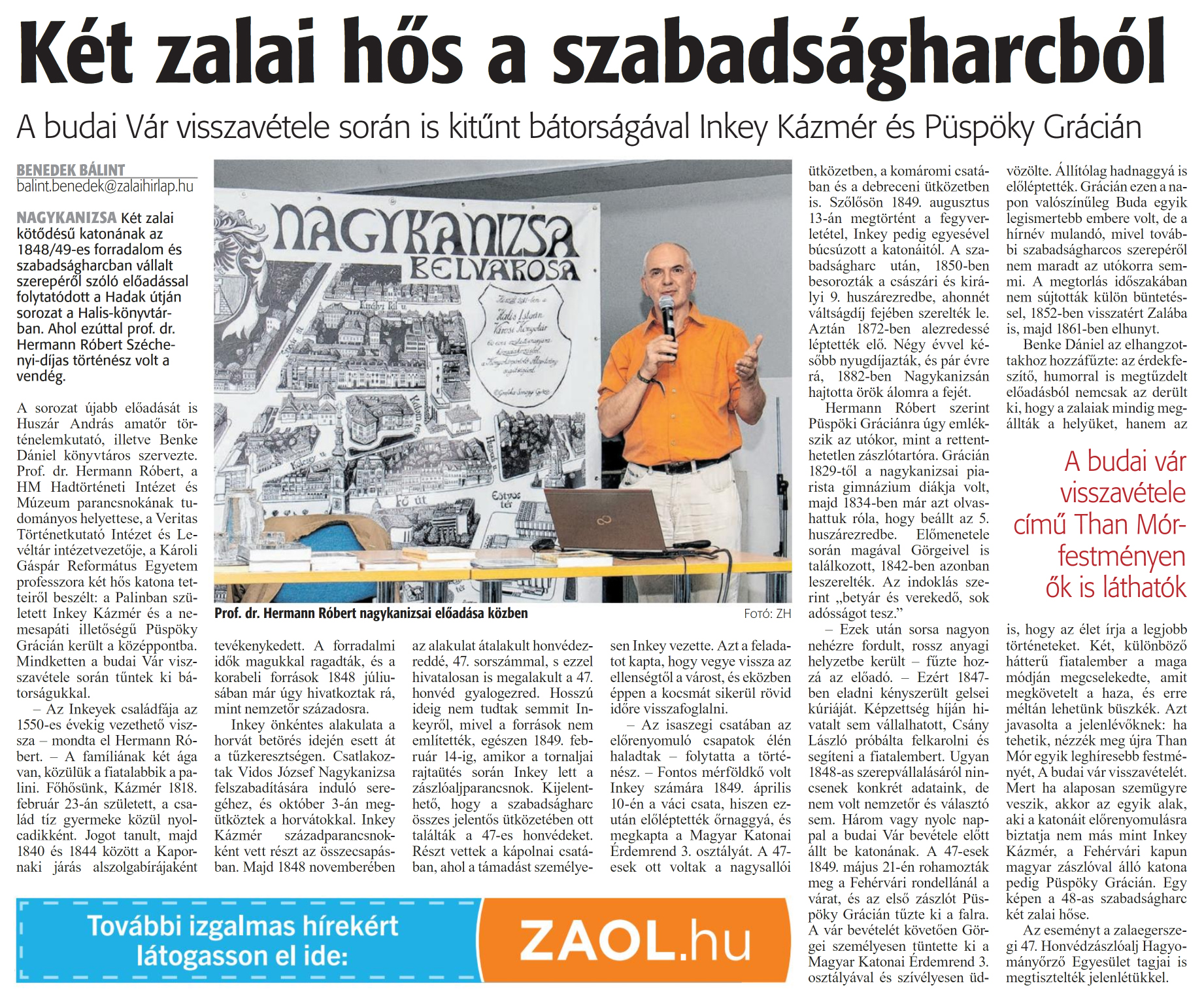 Nyilvános 914 | 1129 | Zalai Hírlap 2024. október 21. 246. szám 5. oldal | Két zalai hős a szabadságharcból A budai Vár visszavétele során is kitűnt bátorságával Inkey Kázmér és Püspöky Grácián BENEDEK BÁLINT balint.benedek@zalaihirlap.hu NAGYKANIZSA Két zalai kötődésű katonának az 1848/49-es forradalom és szabadságharcban vállalt szerepéről szóló előadással folytatódott a Hadak útján sorozat a Halis-könyvtárban. Ahol ezúttal prof. dr. Hermann Róbert Széchenyi-díjas történész volt a vendég. A sorozat újabb előadását is Huszár András amatőr történelemkutató, illetve Benke Dániel könyvtáros szervezte. Prof. dr. Hermann Róbert, a HM Hadtörténeti Intézet és Múzeum parancsnokának tudományos helyettese, a Veritas Történetkutató Intézet és Levéltár intézetvezetője, a Károli Gáspár Református Egyetem professzora két hős katona tetteiről beszélt: a Palinban született Inkey Kázmér és a nemesapáti illetőségű Püspöky Grácián került a középpontba. Mindketten a budai Vár visszavétele során tűntek ki bátorságukkal. - Az Inkeyek családfája az 1550-es évekig vezethető vissza - mondta el Hermann Róbert. - A famíliának két ága van, közülük a fiatalabbik a palini. Főhősünk, Kázmér 1818. február 23-án született, a család tíz gyermeke közül nyolcadikként. Jogot tanult, majd 1840 és 1844 között a Kapornaki járás alszolgabírájaként tevékenykedett. A forradalmi idők magukkal ragadták, és a korabeli források 1848 júliusában már úgy hivatkoztak rá, mint nemzetőr századosra. Inkey önkéntes alakulata a horvát betörés idején esett át a tűzkeresztségen. Csatlakoztak Vidos József Nagykanizsa felszabadítására induló seregéhez, és október 3-án megütköztek a horvátokkal. Inkey Kázmér századparancsnokként vett részt az összecsapásban. Majd 1848 novemberében az alakulat átalakult honvédezreddé, 47. sorszámmal, s ezzel hivatalosan is megalakult a 47. honvéd gyalogezred. Hosszú ideig nem tudtak semmit Inkeyről, mivel a források nem említették, egészen 1849. február 14-ig, amikor a tornaijai rajtaütés során Inkey lett a zászlóaljparancsnok. Kijelenthető, hogy a szabadságharc összes jelentős ütközetében ott találták a 47-es honvédeket. Részt vettek a kápolnai csatában, ahol a támadást személyesen Inkey vezette. Azt a feladatot kapta, hogy vegye vissza az ellenségtől a várost, és eközben éppen a kocsmát sikerül rövid időre visszafoglalni. - Az isaszegi csatában az előrenyomuló csapatok élén haladtak - folytatta a történész. - Fontos mérföldkő volt Inkey számára 1849. április 10-én a váci csata, hiszen ezután előléptették őrnaggyá, és megkapta a Magyar Katonai Érdemrend 3. osztályát. A 47-esek ott voltak a nagysallói ütközetben, a komáromi csatában és a debreceni ütközetben is. Szőlősön 1849. augusztus 13-án megtörtént a fegyverletétel, Inkey pedig egyesével búcsúzott a katonáitól. A szabadságharc után, 1850-ben besorozták a császári és királyi 9. huszárezredbe, ahonnét váltságdíj fejében szerelték le. Aztán 1872-ben alezredessé léptették elő. Négy évvel később nyugdíjazták, és pár évre rá, 1882-ben Nagykanizsán hajtotta örök álomra a fejét. Hermann Róbert szerint Püspöki Gráciánra úgy emlékszik az utókor, mint a rettenthetetlen zászlótartóra. Grácián 1829-től a nagykanizsai piarista gimnázium diákja volt, majd 1834-ben már azt olvashattuk róla, hogy beállt az 5. huszárezredbe. Előmenetele során magával Görgeivel is találkozott, 1842-ben azonban leszerelték. Az indoklás szerint „betyár és verekedő, sok adósságot tesz." - Ezek után sorsa nagyon nehézre fordult, rossz anyagi helyzetbe került - fűzte hozzá az előadó. - Ezért 1847-ben eladni kényszerült gelsei kúriáját. Képzettség híján hivatalt sem vállalhatott, Csány László próbálta felkarolni és segíteni a fiatalembert. Ugyan 1848-as szerepvállalásáról nincsenek konkrét adataink, de nem volt nemzetőr és választó sem. Három vagy nyolc nappal a budai Vár bevétele előtt állt be katonának. A 47-esek 1849. május 21-én rohamozták meg a Fehérvári rondellánál a várat, és az első zászlót Püspöky Grácián tűzte ki a falra. A vár bevételét követően Gör-gei személyesen tüntette ki a Magyar Katonai Érdemrend 3. osztályával és szívélyesen üdvözölte. Állítólag hadnaggyá is előléptették. Grácián ezen a napon valószínűleg Buda egyik legismertebb embere volt, de a hírnév mulandó, mivel további szabadságharcos szerepéről nem maradt az utókorra semmi. A megtorlás időszakában nem sújtották külön büntetéssel, 1852-ben visszatért Zalába is, majd 1861-ben elhunyt. Benke Dániel az elhangzottakhoz hozzáfűzte: az érdekfeszítő, humorral is megtűzdelt előadásból nemcsak az derült ki, hogy a zalaiak mindig megállták a helyüket, hanem az is, hogy az élet írja a legjobb történeteket. Két, különböző hátterű fiatalember a maga módján megcselekedte, amit megkövetelt a haza, és erre méltán lehetünk büszkék. Azt javasolta a jelenlévőknek: ha tehetik, nézzék meg újra Than Mór egyik leghíresebb festményét, A budai vár visszavételét. Mert ha alaposan szemügyre veszik, akkor az egyik alak, aki a katonáit előrenyomulásra biztatja nem más mint Inkey Kázmér, a Fehérvári kapun magyar zászlóval álló katona pedig Püspöky Grácián. Egy képen a 48-as szabadságharc két zalai hőse. Az eseményt a zalaegerszegi 47. Honvédzászlóalj Hagyományőrző Egyesület tagjai is megtisztelték jelenlétükkel. |