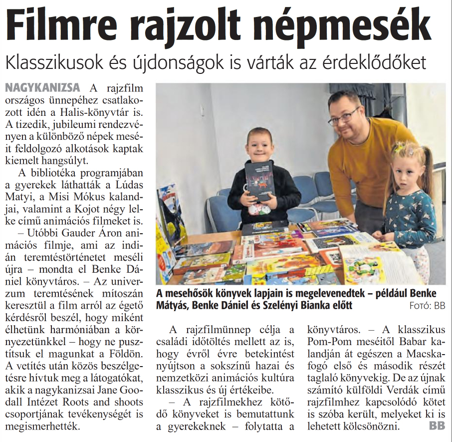Nyilvános 929 | 1159 | Zalai Hírlap 2024. november 18. 268. szám 16. oldal | Filmre rajzolt népmesék Klasszikusok és újdonságok is várták az érdeklődőket NAGYKANIZSA A rajzfilm országos ünnepéhez csatlakozott idén a Halis-könyvtár is. A tizedik, jubileumi rendezvényen a különböző népek meséit feldolgozó alkotások kaptak kiemelt hangsúlyt. A bibliotéka programjában a gyerekek láthatták a Lúdas Matyi, a Misi Mókus kalandjai, valamint a Kojot négy lelke című animációs filmeket is. - Utóbbi Gauder Áron animációs filmje, ami az indián teremtéstörténetet meséli újra - mondta el Benke Dániel könyvtáros. - Az univerzum teremtésének mítoszán keresztül a film arról az égető kérdésről beszél, hogy miként élhetünk harmóniában a környezetünkkel - hogy ne pusztítsuk el magunkat a Földön. A vetítés után közös beszélgetésre hívtuk meg a látogatókat, akik a nagykanizsai Jane Goo-dall Intézet Roots and shoots csoportjának tevékenységét is megismerhették. A rajzfilmünnep célja a családi időtöltés mellett az is, hogy évről évre betekintést nyújtson a sokszínű hazai és nemzetközi animációs kultúra klasszikus és új értékeibe. - A rajzfilmekhez kötődő könyveket is bemutattunk a gyerekeknek - folytatta a könyvtáros. - A klasszikus Pom-Pom meséitől Babar kalandján át egészen a Macskafogó első és második részét taglaló könyvekig. De az újnak számító külföldi Verdák című rajzfilmhez kapcsolódó kötet is szóba került, melyeket ki is lehetett kölcsönözni. BB A mesehősök könyvek lapjain is megelevenedtek - például Benke Mátyás, Benke Dániel és Szelényi Bianka előtt Fotó: BB |