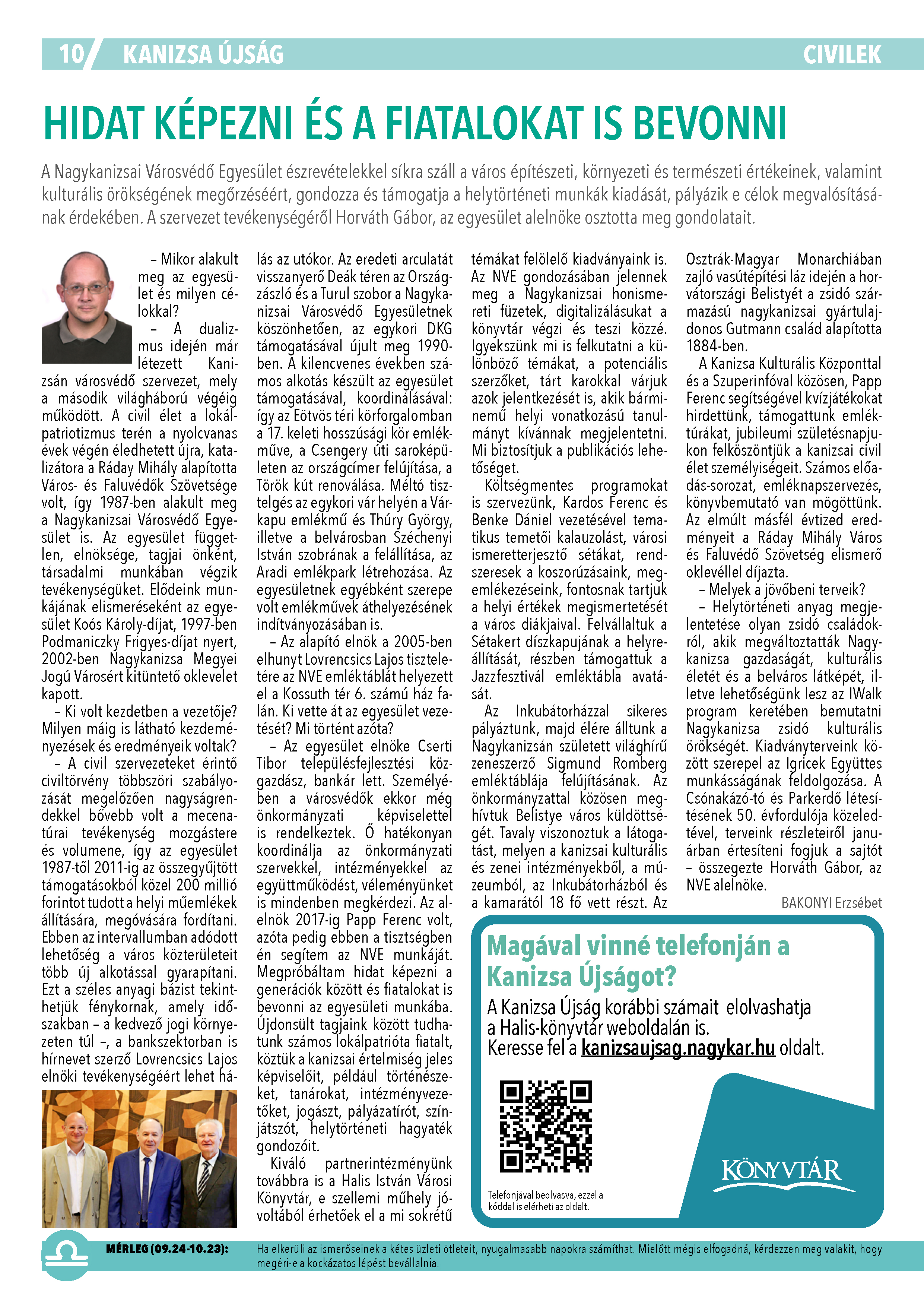 Nyilvános 1260 | 1481 | Kanizsa 2025. január 8. 1. szám 10. oldal | HIDAT KÉPEZNI ÉS A FIATALOKAT IS BEVONNI A Nagykanizsai Városvédő Egyesület észrevételekkel síkra száll a város építészeti, környezeti és természeti értékeinek, valamint kulturális örökségének megőrzéséért, gondozza és támogatja a helytörténeti munkák kiadását, pályázik e célok megvalósításának érdekében. A szervezet tevékenységéről Horváth Gábor, az egyesület alelnöke osztotta meg gondolatait. – Mikor alakult meg az egyesület és milyen célokkal? – A dualizmus idején már létezett Kanizsán városvédő szervezet, mely a második világháború végéig működött. A civil élet a lokálpatriotizmus terén a nyolcvanas évek végén éledhetett újra, katalizátora a Ráday Mihály alapította Város- és Faluvédők Szövetsége volt, így 1987-ben alakult meg a Nagykanizsai Városvédő Egyesület is. Az egyesület független, elnöksége, tagjai önként, társadalmi munkában végzik tevékenységüket. Elődeink munkájának elismeréseként az egyesület Koós Károly-díjat, 1997-ben Podmaniczky Frigyes-díjat nyert, 2002-ben Nagykanizsa Megyei Jogú Városért kitüntető oklevelet kapott. – Ki volt kezdetben a vezetője? Milyen máig is látható kezdeményezések és eredményeik voltak? – A civil szervezeteket érintő civiltörvény többszöri szabályozását megelőzően nagyságrendekkel bővebb volt a mecenatúrai tevékenység mozgástere és volumene, így az egyesület 1987-től 2011-ig az összegyűjtött támogatásokból közel 200 millió forintot tudott a helyi műemlékek állítására, megóvására fordítani. Ebben az intervallumban adódott lehetőség a város közterületeit több új alkotással gyarapítani. Ezt a széles anyagi bázist tekinthetjük fénykornak, amely időszakban – a kedvező jogi környezeten túl –, a bankszektorban is hírnevet szerző Lovrencsics Lajos elnöki tevékenységéért lehet hálás az utókor. Az eredeti arculatát visszanyerő Deák téren az Országzászló és a Turul szobor a Nagykanizsai Városvédő Egyesületnek köszönhetően, az egykori DKG támogatásával újult meg 1990- ben. A kilencvenes években számos alkotás készült az egyesület támogatásával, koordinálásával: így az Eötvös téri körforgalomban a 17. keleti hosszúsági kör emlékműve, a Csengery úti saroképületen az országcímer felújítása, a Török kút renoválása. Méltó tisztelgés az egykori vár helyén a Várkapu emlékmű és Thúry György, illetve a belvárosban Széchenyi István szobrának a felállítása, az Aradi emlékpark létrehozása. Az egyesületnek egyébként szerepe volt emlékművek áthelyezésének indítványozásában is. – Az alapító elnök a 2005-ben elhunyt Lovrencsics Lajos tiszteletére az NVE emléktáblát helyezett el a Kossuth tér 6. számú ház falán. Ki vette át az egyesület vezetését? Mi történt azóta? – Az egyesület elnöke Cserti Tibor településfejlesztési közgazdász, bankár lett. Személyében a városvédők ekkor még önkormányzati képviselettel is rendelkeztek. Ő hatékonyan koordinálja az önkormányzati szervekkel, intézményekkel az együttműködést, véleményünket is mindenben megkérdezi. Az alelnök 2017-ig Papp Ferenc volt, azóta pedig ebben a tisztségben én segítem az NVE munkáját. Megpróbáltam hidat képezni a generációk között és fiatalokat is bevonni az egyesületi munkába. Újdonsült tagjaink között tudhatunk számos lokálpatrióta fiatalt, köztük a kanizsai értelmiség jeles képviselőit, például történészeket, tanárokat, intézményvezetőket, jogászt, pályázatírót, színjátszót, helytörténeti hagyaték gondozóit. Kiváló partnerintézményünk továbbra is a Halis István Városi Könyvtár, e szellemi műhely jóvoltából érhetőek el a mi sokrétű témákat felölelő kiadványaink is. Az NVE gondozásában jelennek meg a Nagykanizsai honismereti füzetek, digitalizálásukat a könyvtár végzi és teszi közzé. Igyekszünk mi is felkutatni a különböző témákat, a potenciális szerzőket, tárt karokkal várjuk azok jelentkezését is, akik bárminemű helyi vonatkozású tanulmányt kívánnak megjelentetni. Mi biztosítjuk a publikációs lehetőséget. Költségmentes programokat is szervezünk, Kardos Ferenc és Benke Dániel vezetésével tematikus temetői kalauzolást, városi ismeretterjesztő sétákat, rendszeresek a koszorúzásaink, megemlékezéseink, fontosnak tartjuk a helyi értékek megismertetését a város diákjaival. Felvállaltuk a Sétakert díszkapujának a helyreállítását, részben támogattuk a Jazzfesztivál emléktábla avatását. A z Inkubátorházzal sikeres pályáztunk, majd élére álltunk a Nagykanizsán született világhírű zeneszerző Sigmund Romberg emléktáblája felújításának. Az önkormányzattal közösen meghívtuk Belistye város küldöttségét. Tavaly viszonoztuk a látogatást, melyen a kanizsai kulturális és zenei intézményekből, a múzeumból, az Inkubátorházból és a kamarától 18 fő vett részt. Az Osztrák-Magyar Monarchiában zajló vasútépítési láz idején a horvátországi Belistyét a zsidó származású nagykanizsai gyártulajdonos Gutmann család alapította 1884-ben. A Kanizsa Kulturális Központtal és a Szuperinfóval közösen, Papp Ferenc segítségével kvízjátékokat hirdettünk, támogattunk emléktúrákat, jubileumi születésnapjukon felköszöntjük a kanizsai civil élet személyiségeit. Számos előadás- sorozat, emléknapszervezés, könyvbemutató van mögöttünk. Az elmúlt másfél évtized eredményeit a Ráday Mihály Város és Faluvédő Szövetség elismerő oklevéllel díjazta. – Melyek a jövőbeni terveik? – Helytörténeti anyag megjelentetése olyan zsidó családokról, akik megváltoztatták Nagykanizsa gazdaságát