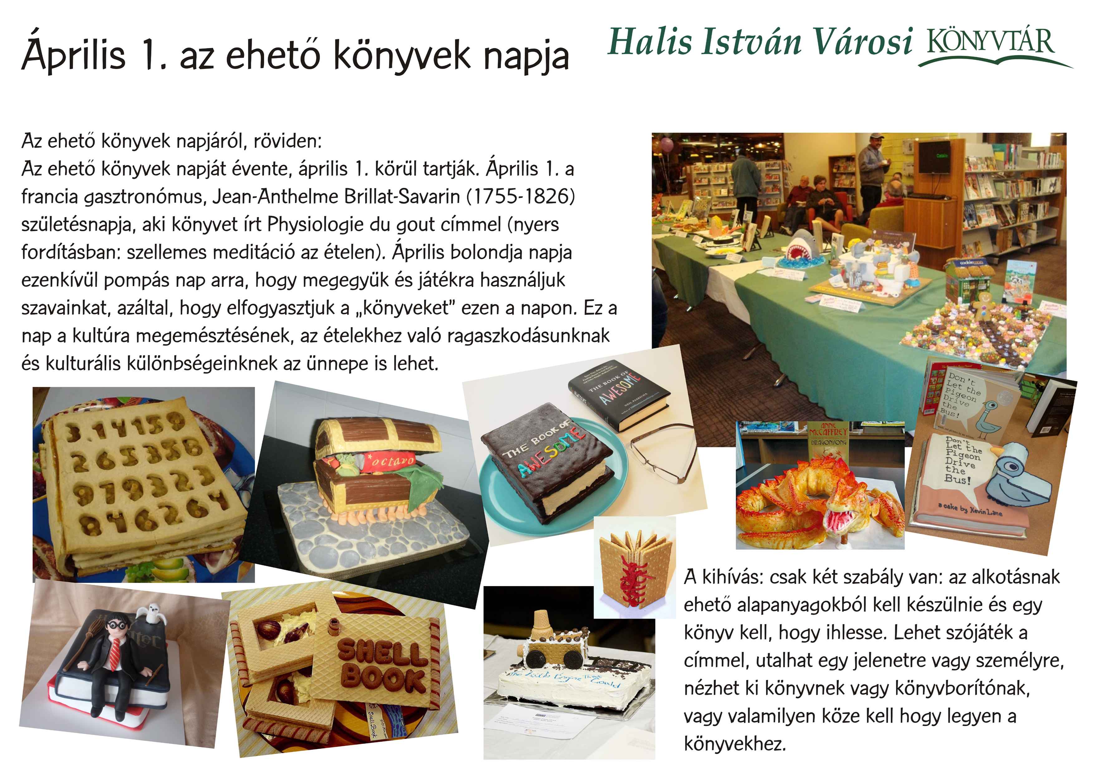 Nyilvános 1394 | 2925 | Április 1 - Ehető könyvek napja | Az ehető könyvek napjáról, röviden: Az ehető könyvek napját évente, április 1. körül tartják. Április 1. a francia gasztronómus, Jean-Anthelme Brillat-Savarin (1755-1826) születésnapja, aki könyvet írt Physiologie du gout címmel (nyers fordításban: szellemes meditáció az ételen). Április bolondja napja ezenkívül pompás nap arra, hogy megegyük és játékra használjuk szavainkat, azáltal, hogy elfogyasztjuk a „könyveket” ezen a napon. Ez a nap a kultúra megemésztésének, az ételekhez való ragaszkodásunknak és kulturális különbségeinknek az ünnepe is lehet. A kihívás: csak két szabály van: az alkotásnak ehető alapanyagokból kell készülnie és egy könyv kell, hogy ihlesse. Lehet szójáték a címmel, utalhat egy jelenetre vagy személyre, nézhet ki könyvnek vagy könyvborítónak, vagy valamilyen köze kell hogy legyen a könyvekhez. |