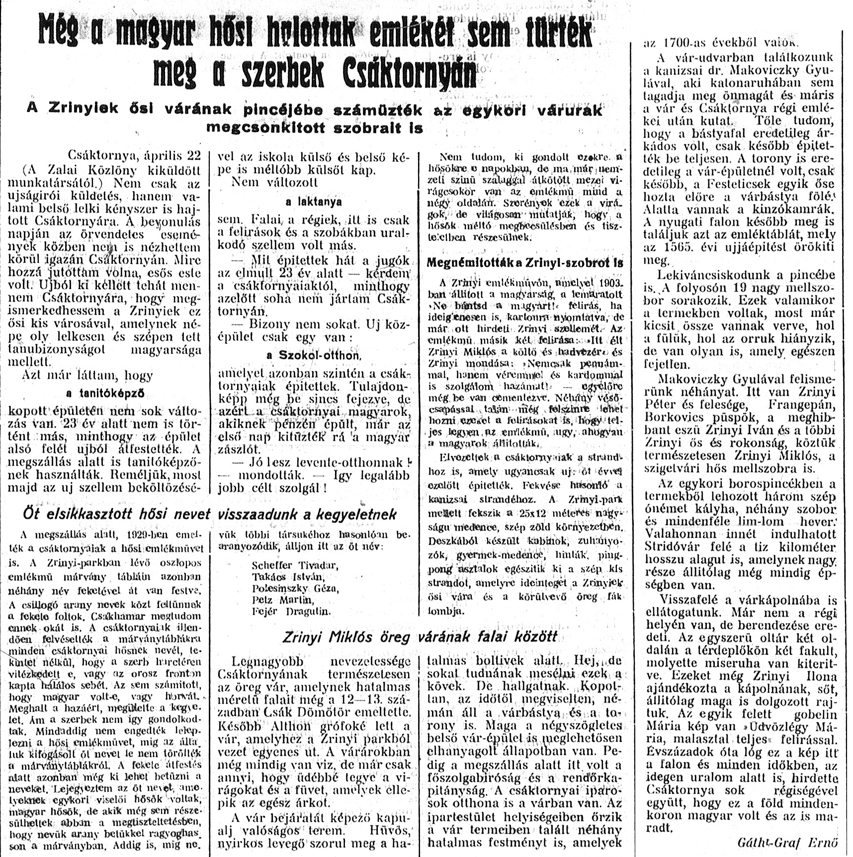 Nyilvános 1198 | 2391 | Rövid leírás | Teljes leírás (7.42 KB) | Zalai Közlöny 1941. április 22. 91. szám 1-2. oldal - Még a magyar hősi halottak... Még a magyar hősi halottak emlékét sem tűrték meg a szerbek Csáktornyán A Zrínyiek ősi várának pincéjébe száműzték az egykori várurak megcsonkított szobrait is Csáktornya, április 22. (A Zalai Közlöny kiküldött munkatársától.) Nem csak az újságírói küldetés, hanem valami belső lelki kényszer is hajtott Csáktornyára. A bevonulás napján az örvendetes események közben nem is nézhettem körül igazán Csáktornyán. Mire hozzá jutottam volna, esős este volt. Újból ki kellett tehát mennem Csáktornyára, hogy megismerkedhessem a Zrínyiek ez ősi kis városával, amelynek népe oly lelkesen és szépen tett tanúbizonyságot magyarsága mellett. Azt már láttam, hogy a tanítóképző kopott épületén nem sok változás van. 23 év alatt nem is történt más, minthogy az épület alsó felét újból átfestették. A megszállás alatt is tanítóképzőnek használták. Reméljük, most majd az új szellem beköltözésével az iskola külső és belső képe is méltóbb külsői kap. Nem változott a laktanya sem. Falai a régiek, itt is csak a felírások és a szobákban uralkodó szellem volt más. – Mit építettek hát a jugók az elmúlt 23 év alatt – kérdem a csáktornyaiaktól, minthogy azelőtt soha nem jártam Csáktornyán. – Bizony nem sokat. Új középület csak egy van: a Szokol-otthon, amelyet azonban szintén a csáktornyaiak építettek. Tulajdonképp még be sincs fejezve, de azért a csáktornyai magyarok, akiknek pénzén épült, már az első nap kitűzték rá a magyar zászlót. – Jó lesz levente-otthonnak! – mondották. – Így legalább jobb célt szolgál! Öt elsikkasztott hősi nevet visszaadunk a kegyeletnek A megszállás alatt, 1929-ben emelték a csáktornyaiak a hősi emlékművet is. A Zrínyi-parkban lévő oszlopos emlékmű márvány tábláin azonban néhány név feketével át van festve. A csillogó arany nevek közt feltűnnek a fekete foltok. Csakhamar megtudom ennek okát is. A csáktornyaiak illendően felvésették a márványtáblákra minden csáktornyai hősnek nevét, tekintet nélkül, hogy a szerb harctéren vitézkedett-e, vagy az orosz fronton kapta halálos sebét. Az sem számított, hogy magyar volt-e, vagy horvát. Meghalt a hazáért, megillette a kegyelet. Ám a szerbek nem így gondolkodtak. Mindaddig nem engedték leleplezni a hősi emlékművet, míg az általuk kifogásolt öt nevet le nem törölték a márványtáblákról. A fekete átfestés alatt azonban még ki lehet betűzni a neveket. Lejegyeztem az öt nevet, amelyeknek egykori viselői hősök voltak, magyar hősök, de akik még sem részesülhettek abban a megtiszteltetésben, hogy nevük arany betűkkel ragyoghasson a márványban. Addig is, míg nevük többi társukéhoz hasonlóan bearanyozódik, álljon itt az öt név: Scheffer Tivadar, Takács István, Polesinszky Géza, Petz Martin, Fejér Dragutin. Nem tudom, ki gondolt ezekre a hősökre e napokban, de ma már nemzeti színű szalaggal átkötött mezei virágcsokor van az emlékmű mind a négy oldalán. Szerények ezek a virágok, de világosan mutatják, hogy a hősök méltó megbecsülésben és tiszteletben részesülnek. Megnémították a Zrínyi-szobrot is A Zrínyi emlékművön, amelyet 1903-ban állított a magyarság, a lemaratott „Ne bántsd a magyart!” felírás, ha ideiglenesen is, kartonra nyomtatva, de már ott hirdeti Zrínyi szellemét. Az emlékmű másik két felírása: „Itt élt Zrínyi Miklós a költő és hadvezér” és Zrínyi mondása: „Nemcsak pennámmal, hanem véremmel és kardommal is szolgálom hazámat!” - egyelőre még be van cementezve. Néhány vésőcsapással talán még felszínre lehet hozni ezeket a felírásokat is, hogy teljes legyen az emlékmű, úgy, ahogyan a magyarok állították. Elvezettek a csáktornyaiak a strandhoz is, amely ugyancsak új: öt évvel ezelőtt építették. Fekvése hasonló a kanizsai strandéhoz. A Zrínyi-park mellett fekszik a 25x12 méteres nagyságú medence, szép zöld környezetben. Deszkából készült kabinok, zuhanyozók, gyermek-medence, hinták, pingpong asztalok egészítik ki a szép kis strandot, amelyre ideinteget a Zrínyiek ősi vára és a körülvevő öreg fák lombja. Zrínyi Miklós öreg várának falai között Legnagyobb nevezetessége Csáktornyának természetesen az öreg vár, amelynek hatalmas méretű falait még a 12—13. században Csák Dömötör emeltette. Később Althon grófoké lett a vár, amelyhez a Zrínyi parkból vezet egyenes út. A várárokban még mindig van víz, de már csak annyi, hogy üdébbé tegye a virágokat és a füvet, amelyek ellepik az egész árkot. A vár bejáratát képező kapualj valóságos terem. Hűvös, nyirkos levegő szorul meg a hatalmas boltívek alatt. Hej, de sokat tudnának mesélni ezek a kövek. De hallgatnak. Kopottan, az időtől megviselten, némán áll a várbástya és a torony is. Maga a négyszögletes belső vár-épület is, meglehetősen elhanyagolt állapotban van. Pedig a megszállás alatt itt volt a főszolgabíróság és a rendőrkapitányság. A csáktornyai iparosok otthona is a várban van. Az ipartestület helyiségeiben őrzik a vár termeiben talált néhány hatalmas festményt is, amelyek az 1700-as évekből valók. A vár-udvarban találkozunk a kanizsai dr. Makoviczky Gyulával, aki katonaruhában sem tagadja meg önmagát és máris a vár és Csáktornya régi emlékei után kutat. Tőle tudom, hogy a bástyafal eredetileg árkádos volt, csak később építették be teljesen. A torony is eredetileg a vár-épületnél volt, csak később, a Festeticsek egyik őse hozta előre a várbástya fölé. Alatta vannak a kínzókamrák. A nyugati falon később meg is találjuk azt az em