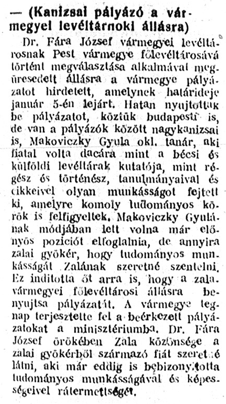 Nyilvános 1192 | 2299 | Zalai Közlöny 1939. január 14. 11. szám 5. oldal - Kanizsai pályázó a vármegyei levéltárnoki állásra | – (Kanizsai pályázó a vármegyei levéltárnoki állásra) Dr. Fára József vármegyei levéltárosnak Pest vármegye főlevéltárosává történt megválasztása alkalmával megüresedett állásra a vármegye pályázatot hirdetett, amelynek határideje január 5-én lejárt. Hatan nyújtottak be pályázatot, köztük budapesti is, de van a pályázók között nagykanizsai is, Makoviczky Gyula okl. tanár, aki fiatal volta dacára mint a bécsi és külföldi levéltárak kutatója, mint régész és történész, tanulmányaival és cikkeivel olyan munkásságot fejtett ki, amelyre komoly tudományos körök is felfigyeltek. Makoviczky Gyulának módjában lett volna már előnyös poziciót elfoglalnia, de annyira zalai gyökér, hogy tudományos munkásságát Zalának szeretné szentelni. Ez indította őt arra is, hogy a zalavármegyei főlevéltárosi állásra benyújtsa pályázatát. A vármegye tegnap terjesztette fel a beérkezett pályázatokat a minisztériumba. Dr. Fára József örökében Zala közönsége a zalai gyökérből származó fiát szeretné látni, aki már eddig is bebizonyította tudományos munkásságával és képességeivel rátermettségét. |