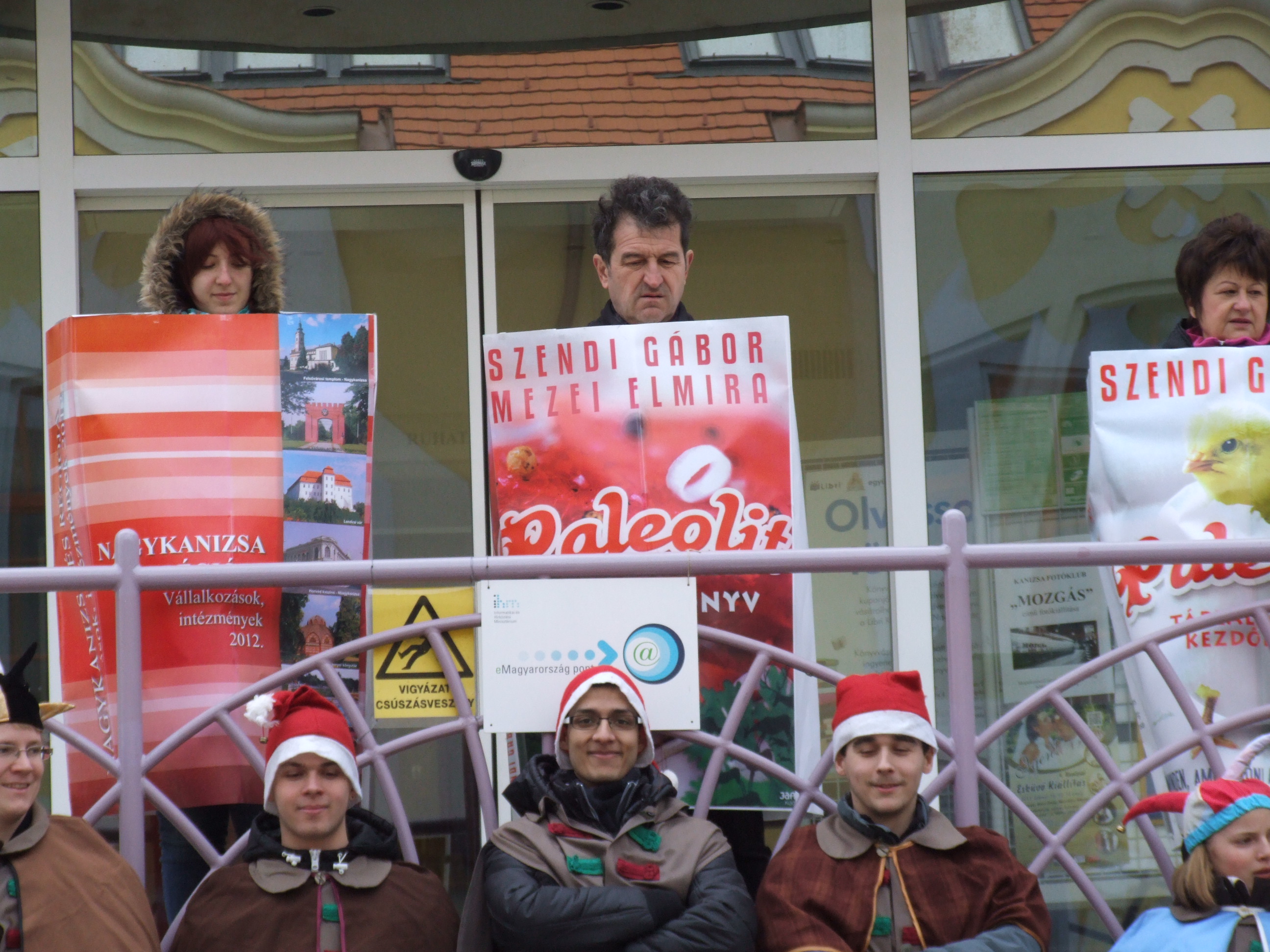 Nyilvános 1396 | 3106 | 2013. február 9. A farsangi fánkfesztiválra készülve felhívásban kértük olvasóinkat, hogy öltsék magukra kedves könyvüket. Egy „könyvespolcnyi” jelentkező vette magára kedves olvasmányát, az ő vonulásukról készültek ezek a képek. A környezetükben néhol láthatók a Nagykanizsai Gólyalábasok, akik szintén a könyvtárhoz kötődnek. A „felvonuló kötetek” a könyvtár épületében még megtekinthetők. | |