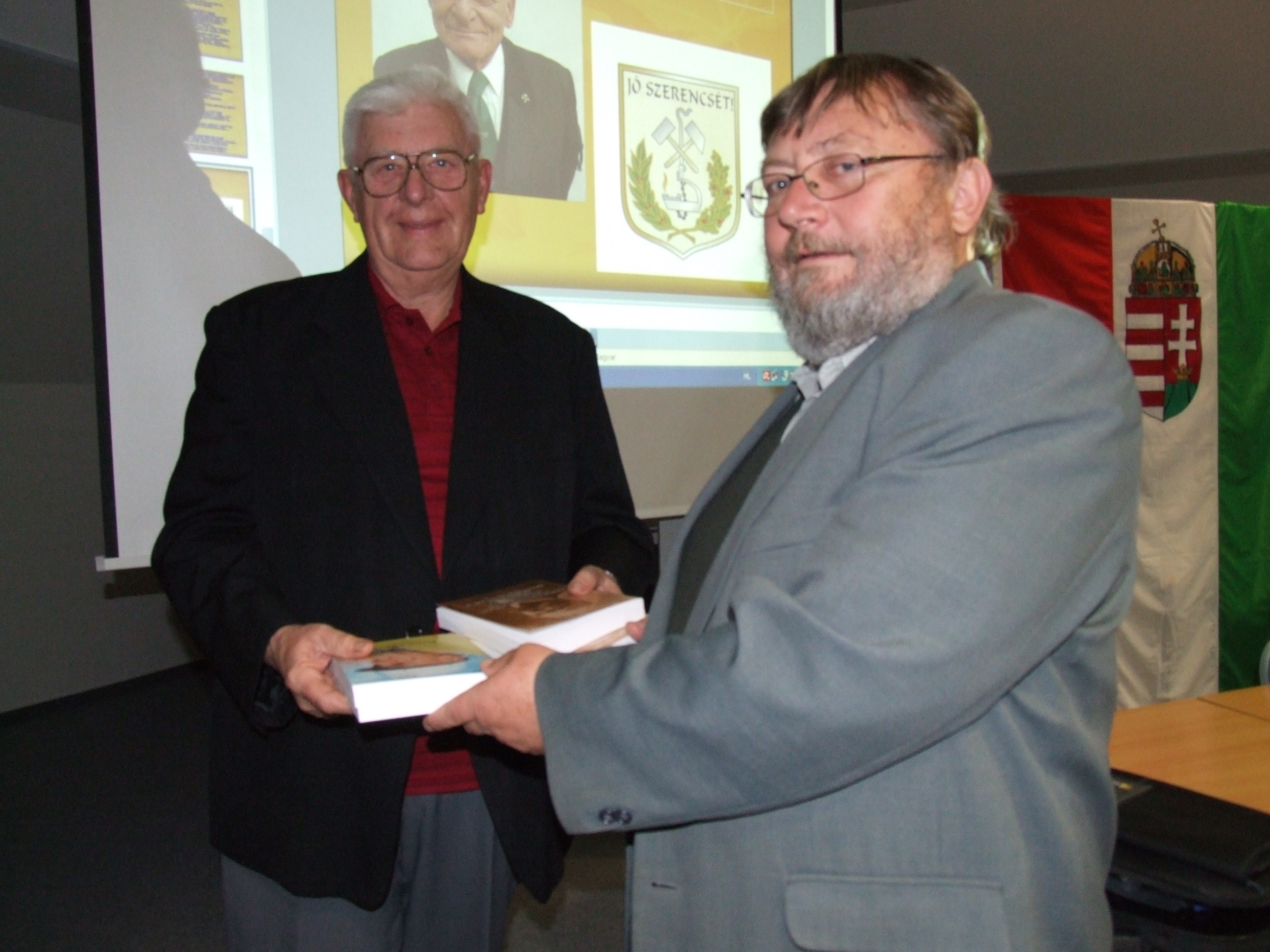 Udvardi Géza átadja a Három bányászgeneráció válogatott iratai és emlékezései öt kötetét a Halis Könyvtárnak.JPG