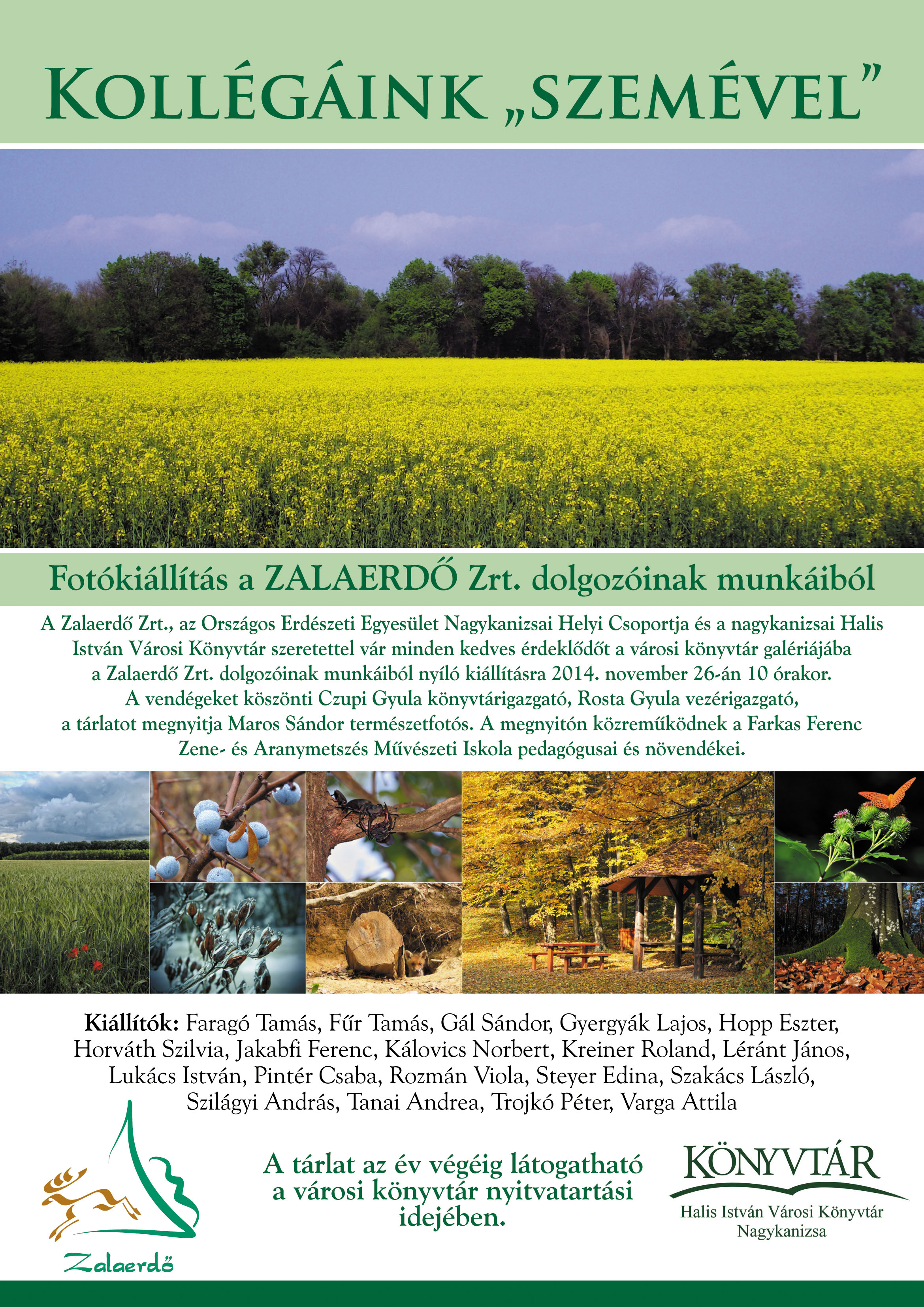 Nyilvános 1544 | 2980 | Rövid leírás | Teljes leírás (1.1 KB) | Kollégáink szemével Fotókiállítás a ZALAERDŐ Zrt. dolgozóinak munkáiból A Zalaerdő Zrt., az Országos Erdészeti Egyesület Nagykanizsai Helyi Csoportja és a nagykanizsai Halis István Városi Könyvtár szeretettel vár minden kedves érdeklődőt a városi könyvtár galériájába a Zalaerdő Zrt. dolgozóinak munkáiból nyíló kiállításra 2014. november 26-án 10 órakor. A vendégeket köszönti Czupi Gyula könyvtárigazgató, Rosta Gyula vezérigazgató, a tárlatot megnyitja Maros Sándor természetfotós. A megnyitón közreműködnek a Farkas Ferenc Zene- és Aranymetszés Művészeti Iskola pedagógusai és növendékei. Kiállítók: Faragó Tamás, Fűr Tamás, Gál Sándor, Gyergyák Lajos, Hopp Eszter, Horváth Szilvia, Jakabfi Ferenc, Kálovics Norbert, Kreiner Roland, Léránt János, Lukács István, Pintér Csaba, Rozmán Viola, Steyer Edina, Szakács László, Szilágyi András, Tanai Andrea, Trojkó Péter, Varga Attila A tárlat az év végéig látogatható a városi könyvtár nyitvatartási idejében. |