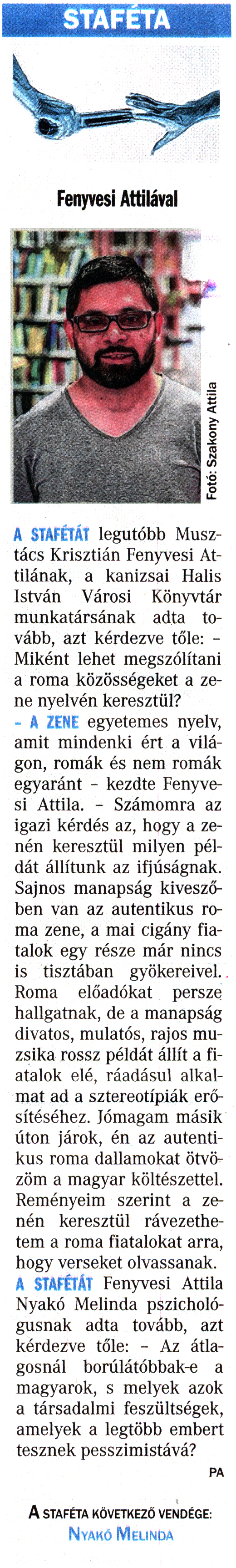 Nyilvános 1879 | 4953 | Vasárnapi Zalai Hírlap 2017. június 3. 22. szám 5. oldal | STAFÉTA Fenyvesi Attilával A STAFÉTÁT legutóbb Musztács Krisztián Fenyvesi Attilának, a kanizsai Halis István Városi Könyvtár munkatársának adta tovább, azt kérdezve tőle: - Miként lehet megszólítani a roma közösségeket a zene nyelvén keresztül? - A ZENE egyetemes nyelv, amit mindenki ért a világon, romák és nem romák egyaránt - kezdte Fenyvesi Attila. - Számomra az igazi kérdés az, hogy a zenén keresztül milyen példát állítunk az ifjúságnak. Sajnos manapság kiveszőben van az autentikus roma zene, a mai cigány fiatalok egy része már nincs is tisztában gyökereivel. Roma előadókat persze hallgatnak, de a manapság divatos, mulatós, rajos muzsika rossz példát állít a fiatalok elé, ráadásul alkalmat ad a sztereotípiák erősítéséhez. Jómagam másik úton járok, én az autentikus roma dallamokat ötvözöm a magyar költészettel. Reményeim szerint a zenén keresztül rávezethetem a roma fiatalokat arra, hogy verseket olvassanak. A STAFÉTÁT Fenyvesi Attila Nyakó Melinda pszichológusnak adta tovább, azt kérdezve tőle: - Az átlagosnál borúlátóbbak-e a magyarok, s melyek azok a társadalmi feszültségek, amelyek a legtöbb embert tesznek pesszimistává? PA A STAFÉTA KÖVETKEZŐ VENDÉGE: Nyakó Melinda |