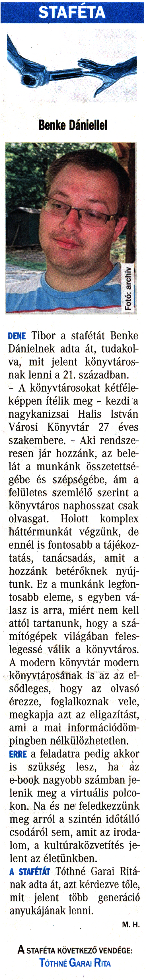 Nyilvános 2354 | 5729 | Vasárnapi Zalai Hírlap 2016. június 5. 20. szám 5. oldal | STAFÉTA DENE Tibor a stafétát Benke Dánielnek adta át, tudakolva, mit jelent könyvtárosnak lenni a 21. században. - A könyvtárosokat kétféleképpen ítélik meg - kezdi a nagykanizsai Halis István Városi Könyvtár 27 éves szakembere. - Aki rendszeresen jár hozzánk, az belelát a munkánk összetettségébe és szépségébe, ám a felületes szemlélő szerint a könyvtáros naphosszat csak olvasgat. Holott komplex háttérmunkát végzünk, de ennél is fontosabb a tájékoztatás, tanácsadás, amit a hozzánk betérőknek nyújtunk. Ez a munkánk legfontosabb eleme, s egyben válasz is arra, miért nem kell attól tartanunk, hogy a számítógépek világában feleslegessé válik a könyvtáros. A modern könyvtár modern könyvtárosának is az az elsődleges, hogy az olvasó érezze, foglalkoznak vele, megkapja azt az eligazítást, ami a mai információdömpingben nélkülözhetetlen. ERRE a feladatra pedig akkor is szükség lesz, ha az e-book nagyobb számban jelenik meg a virtuális polcokon. Na és ne feledkezzünk meg arról a szintén időtálló csodáról sem, amit az irodalom, a kultúraközvetítés jelent az életünkben. A STAFÉTÁT Tóthné Garai Ritának adta át, azt kérdezve tőle, mit jelent több generáció anyukájának lenni. M. H. A staféta következő vendége: Tóthné Garai Rita |