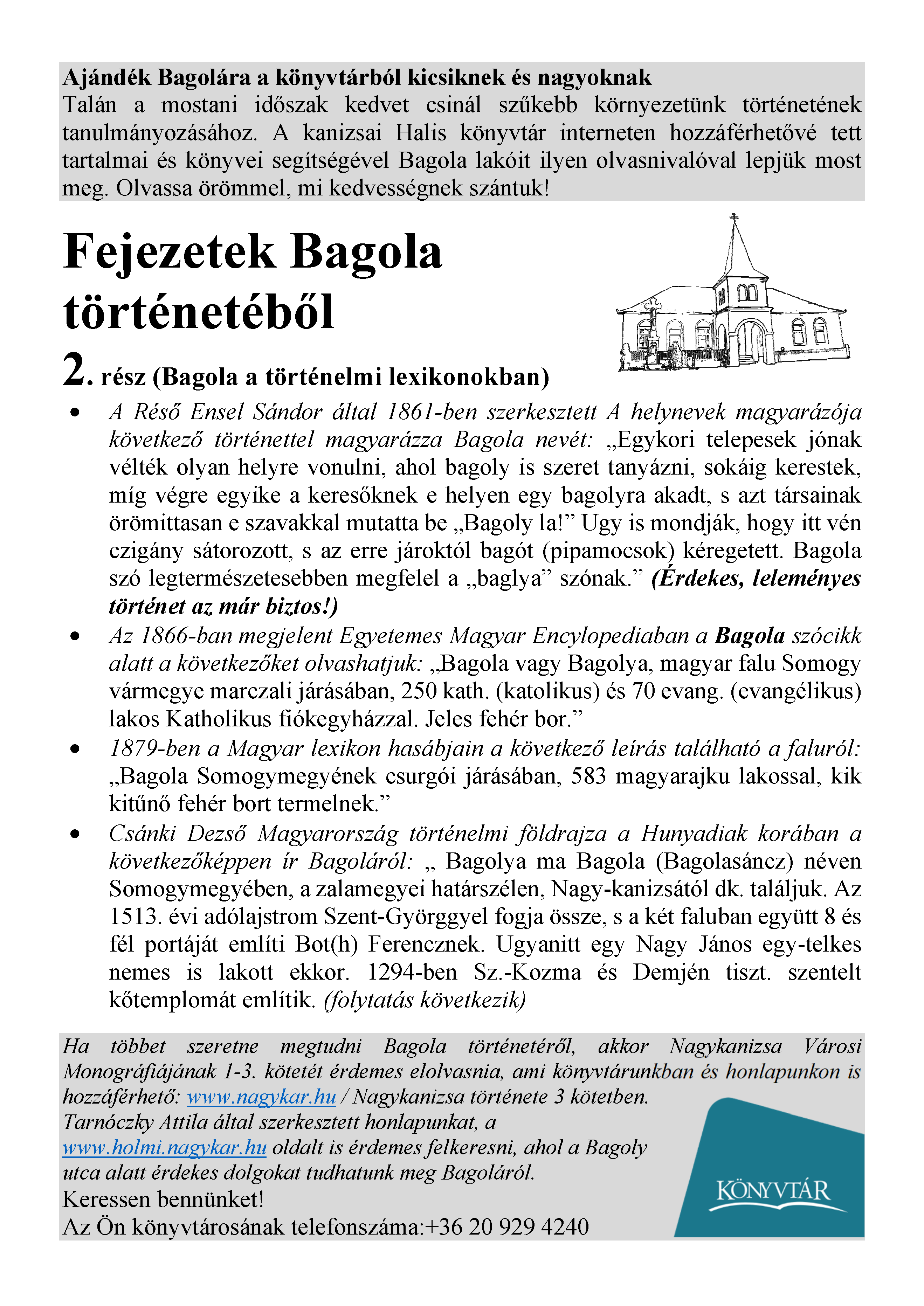 Nyilvános 1712 | 2592 | Rövid leírás | Teljes leírás (2.67 KB) | Megjelenés: 2021. április 9. Ajándék Bagolára a könyvtárból kicsiknek és nagyoknak Talán a mostani időszak kedvet csinál szűkebb környezetünk történetének tanulmányozásához. A kanizsai Halis könyvtár interneten hozzáférhetővé tett tartalmai és könyvei segítségével Bagola lakóit ilyen olvasnivalóval lepjük most meg. Olvassa örömmel, mi kedvességnek szántuk! Fejezetek Bagola történetéből 2. rész (Bagola a történelmi lexikonokban) • A Réső Ensel Sándor által 1861-ben szerkesztett A helynevek magyarázója következő történettel magyarázza Bagola nevét: „Egykori telepesek jónak vélték olyan helyre vonulni, ahol bagoly is szeret tanyázni, sokáig kerestek, míg végre egyike a keresőknek e helyen egy bagolyra akadt, s azt társainak örömittasan e szavakkal mutatta be „Bagoly la!” Ugy is mondják, hogy itt vén czigány sátorozott, s az erre jároktól bagót (pipamocsok) kéregetett. Bagola szó legtermészetesebben megfelel a „baglya” szónak.” (Érdekes, leleményes történet az már biztos!) • Az 1866-ban megjelent Egyetemes Magyar Encylopediaban a Bagola szócikk alatt a következőket olvashatjuk: „Bagola vagy Bagolya, magyar falu Somogy vármegye marczali járásában, 250 kath. (katolikus) és 70 evang. (evangélikus) lakos Katholikus fiókegyházzal. Jeles fehér bor.” • 1879-ben a Magyar lexikon hasábjain a következő leírás található a faluról: „Bagola Somogymegyének csurgói járásában, 583 magyarajku lakossal, kik kitűnő fehér bort termelnek.” • Csánki Dezső Magyarország történelmi földrajza a Hunyadiak korában a következőképpen ír Bagoláról: „ Bagolya ma Bagola (Bagolasáncz) néven Somogymegyében, a zalamegyei határszélen, Nagy-kanizsától dk. találjuk. Az 1513. évi adólajstrom Szent-Györggyel fogja össze, s a két faluban együtt 8 és fél portáját említi Bot(h) Ferencznek. Ugyanitt egy Nagy János egy-telkes nemes is lakott ekkor. 1294-ben Sz.-Kozma és Demjén tiszt. szentelt kőtemplomát említik. (folytatás következik) Ha többet szeretne megtudni Bagola történetéről, akkor Nagykanizsa Városi Monográfiájának 1-3. kötetét érdemes elolvasnia, ami könyvtárunkban és honlapunkon is hozzáférhető: www.nagykar.hu / Nagykanizsa története 3 kötetben. Tarnóczky Attila által szerkesztett honlapunkat, a www.holmi.nagykar.hu oldalt is érdemes felkeresni, ahol a Bagoly utca alatt érdekes dolgokat tudhatunk meg Bagoláról. Keressen bennünket! Az Ön könyvtárosának telefonszáma:+36 20 929 4240 |