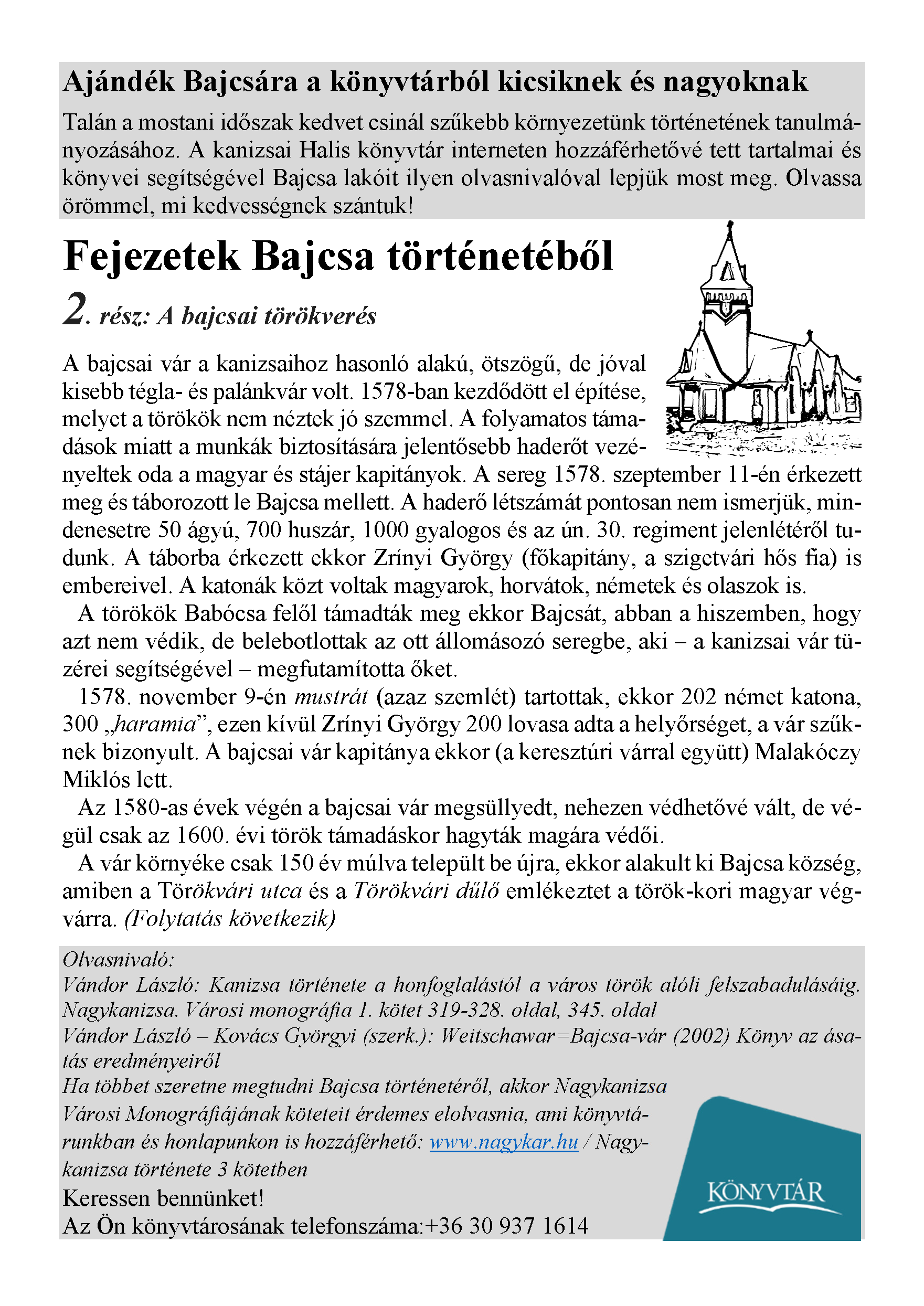 Nyilvános 1951 | 3279 | Rövid leírás | Teljes leírás (2.72 KB) | Megjelent: 2021. április 9. Ajándék Bajcsára a könyvtárból kicsiknek és nagyoknak Talán a mostani időszak kedvet csinál szűkebb környezetünk történetének tanulmányozásához. A kanizsai Halis könyvtár interneten hozzáférhetővé tett tartalmai és könyvei segítségével Bajcsa lakóit ilyen olvasnivalóval lepjük most meg. Olvassa örömmel, mi kedvességnek szántuk! Fejezetek Bajcsa történetéből 2. rész: A bajcsai törökverés A bajcsai vár a kanizsaihoz hasonló alakú, ötszögű, de jóval kisebb tégla- és palánkvár volt. 1578-ban kezdődött el építése, melyet a törökök nem néztek jó szemmel. A folyamatos támadások miatt a munkák biztosítására jelentősebb haderőt vezényeltek oda a magyar és stájer kapitányok. A sereg 1578. szeptember 11-én érkezett meg és táborozott le Bajcsa mellett. A haderő létszámát pontosan nem ismerjük, mindenesetre 50 ágyú, 700 huszár, 1000 gyalogos és az ún. 30. regiment jelenlétéről tudunk. A táborba érkezett ekkor Zrínyi György (főkapitány, a szigetvári hős fia) is embereivel. A katonák közt voltak magyarok, horvátok, németek és olaszok is. A törökök Babócsa felől támadták meg ekkor Bajcsát, abban a hiszemben, hogy azt nem védik, de belebotlottak az ott állomásozó seregbe, aki – a kanizsai vár tüzérei segítségével – megfutamította őket. 1578. november 9-én mustrát (azaz szemlét) tartottak, ekkor 202 német katona, 300 „haramia”, ezen kívül Zrínyi György 200 lovasa adta a helyőrséget, a vár szűknek bizonyult. A bajcsai vár kapitánya ekkor (a keresztúri várral együtt) Malakóczy Miklós lett. Az 1580-as évek végén a bajcsai vár megsüllyedt, nehezen védhetővé vált, de végül csak az 1600. évi török támadáskor hagyták magára védői. A vár környéke csak 150 év múlva települt be újra, ekkor alakult ki Bajcsa község, amiben a Törökvári utca és a Törökvári dűlő emlékeztet a török-kori magyar végvárra. (Folytatás következik) Olvasnivaló: Vándor László: Kanizsa története a honfoglalástól a város török alóli felszabadulásáig. Nagykanizsa. Városi monográfia 1. kötet 319-328. oldal, 345. oldal Vándor László – Kovács Györgyi (szerk.): Weitschawar=Bajcsa-vár (2002) Könyv az ásatás eredményeiről Ha többet szeretne megtudni Bajcsa történetéről, akkor Nagykanizsa Városi Monográfiájának köteteit érdemes elolvasnia, ami könyvtá- runkban és honlapunkon is hozzáférhető: www.nagykar.hu / Nagy- kanizsa története 3 kötetben Keressen bennünket! |