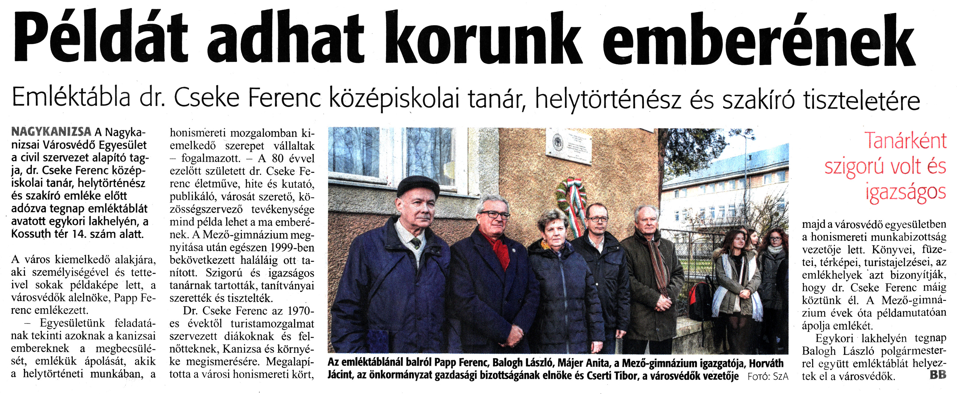 Nyilvános 1072 | 1426 | Zalai Hírlap 2019. december 18. 293. szám 4. oldal | Példát adhat korunk emberének Emléktábla dr. Cseke Ferenc középiskolai tanár, helytörténész és szakíró tiszteletére NAGYKANIZSA A Nagykanizsai Városvédő Egyesület a civil szervezet alapító tagja, dr. Cseke Ferenc középiskolai tanár, helytörténész és szakíró emléke előtt adózva tegnap emléktáblát avatott egykori lakhelyén, a Kossuth tér 14. szám alatt. A város kiemelkedő alakjára, aki személyiségével és tetteivel sokak példaképe lett, a városvédők alelnöke, Papp Ferenc emlékezett. - Egyesületünk feladatának tekinti azoknak a kanizsai embereknek a megbecsülését, emlékük ápolását, akik a helytörténeti munkában, a honismereti mozgalomban kiemelkedő szerepet vállaltak - fogalmazott. - A 80 évvel ezelőtt született dr. Cseke Ferenc életműve, hite és kutató, publikáló, városát szerető, közösségszervező tevékenysége mind példa lehet a ma emberének. A Mező-gimnázium megnyitása után egészen 1999-ben bekövetkezett haláláig ott tanított. Szigorú és igazságos tanárnak tartották, tanítványai szerették és tisztelték. Dr. Cseke Ferenc az 1970-es évektől turistamozgalmat szervezett diákoknak és felnőtteknek, Kanizsa és környéke megismerésére. Megalapította a városi honismereti kört, majd a városvédő egyesületben a honismereti munkabizottság vezetője lett. Könyvei, füzetei, térképei, turistajelzései, az emlékhelyek azt bizonyítják, hogy dr. Cseke Ferenc máig köztünk él. A Mező-gimnázium évek óta példamutatóan ápolja emlékét. Egykori lakhelyén tegnap Balogh László polgármesterrel együtt emléktáblát helyeztek el a városvédők. BB Az emléktáblánál balról Papp Ferenc, Balogh László, Májer Anita, a Mező-gimnázium igazgatója, Horváth Jácint, az önkormányzat gazdasági bizottságának elnöke és Cserti Tibor, a városvédők vezetője Fotó: SzA |