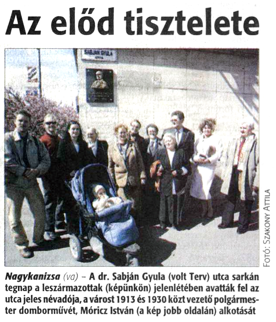 Nyilvános 926 | 1195 | Zalai Hírlap 2008. április 11. 4. oldal | Az előd tisztelete Nagykanizsa (va) - A dr. Sabján Gyula (volt Terv) utca sarkán tegnap a leszármazottak (képünkön) jelenlétében avatták fel az utca jeles névadója, a várost 1913 és 1930 közt vezető polgármester domborművét, Móricz István (a kép jobb oldalán) alkotását |